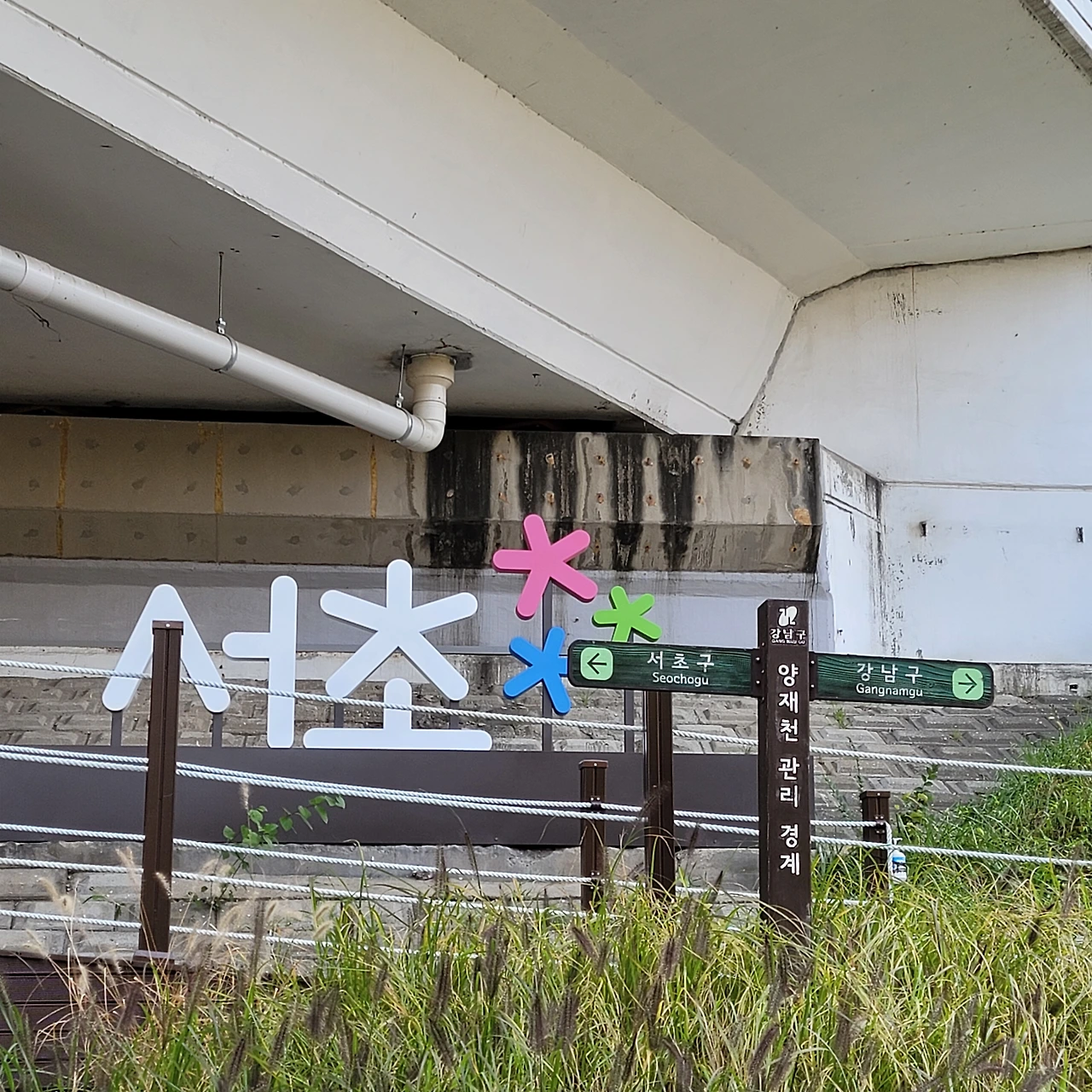 강남구와 서초구의 경계인 영동 2교. 푸르게가 강남구에 살지만 강남구 슬로건인 MEMEWE와 저 상징물 촌스럽기 그지없다. 서초는 간지 작렬