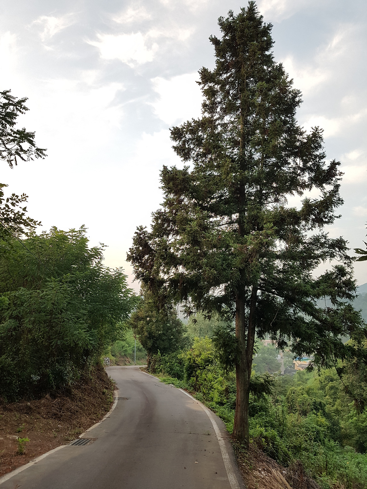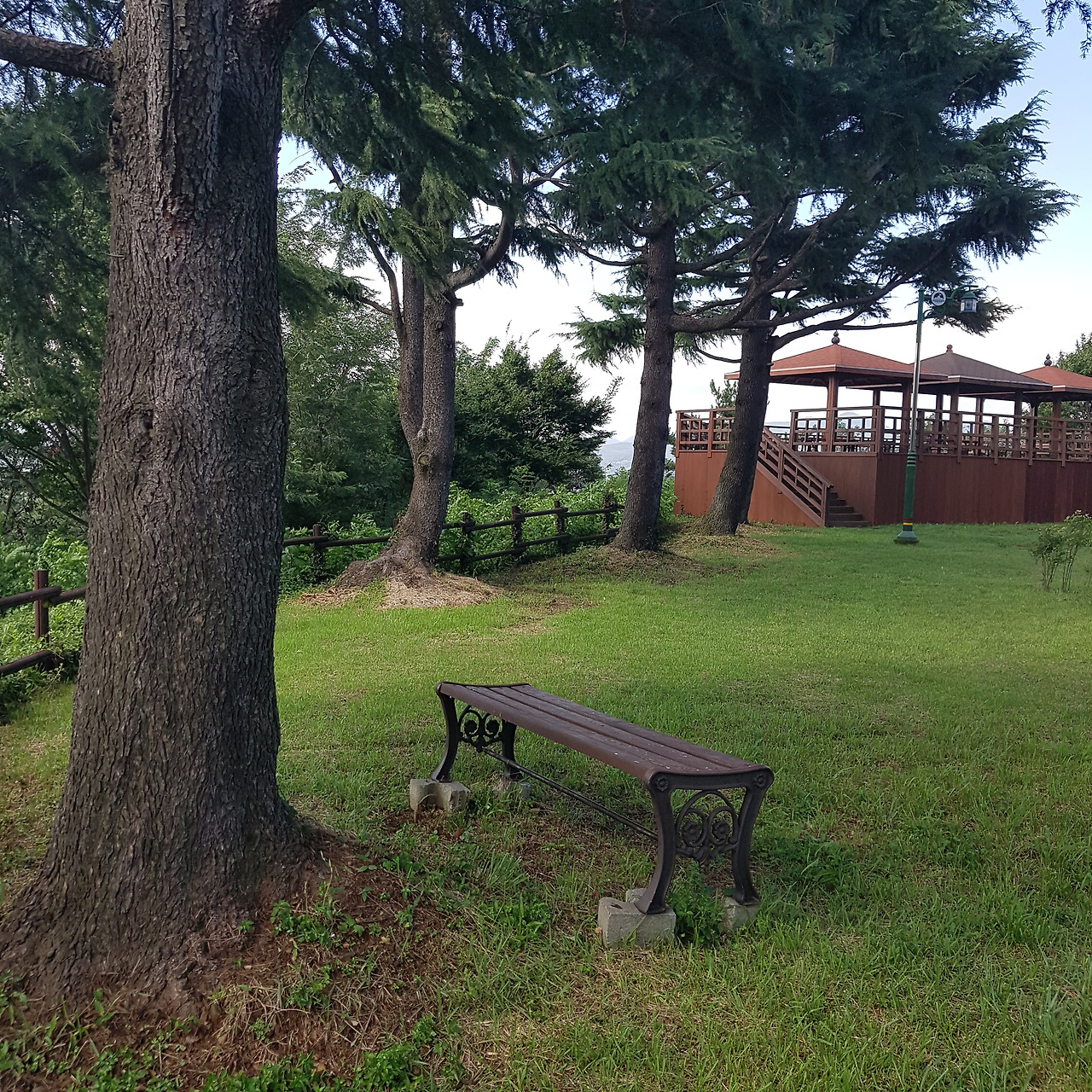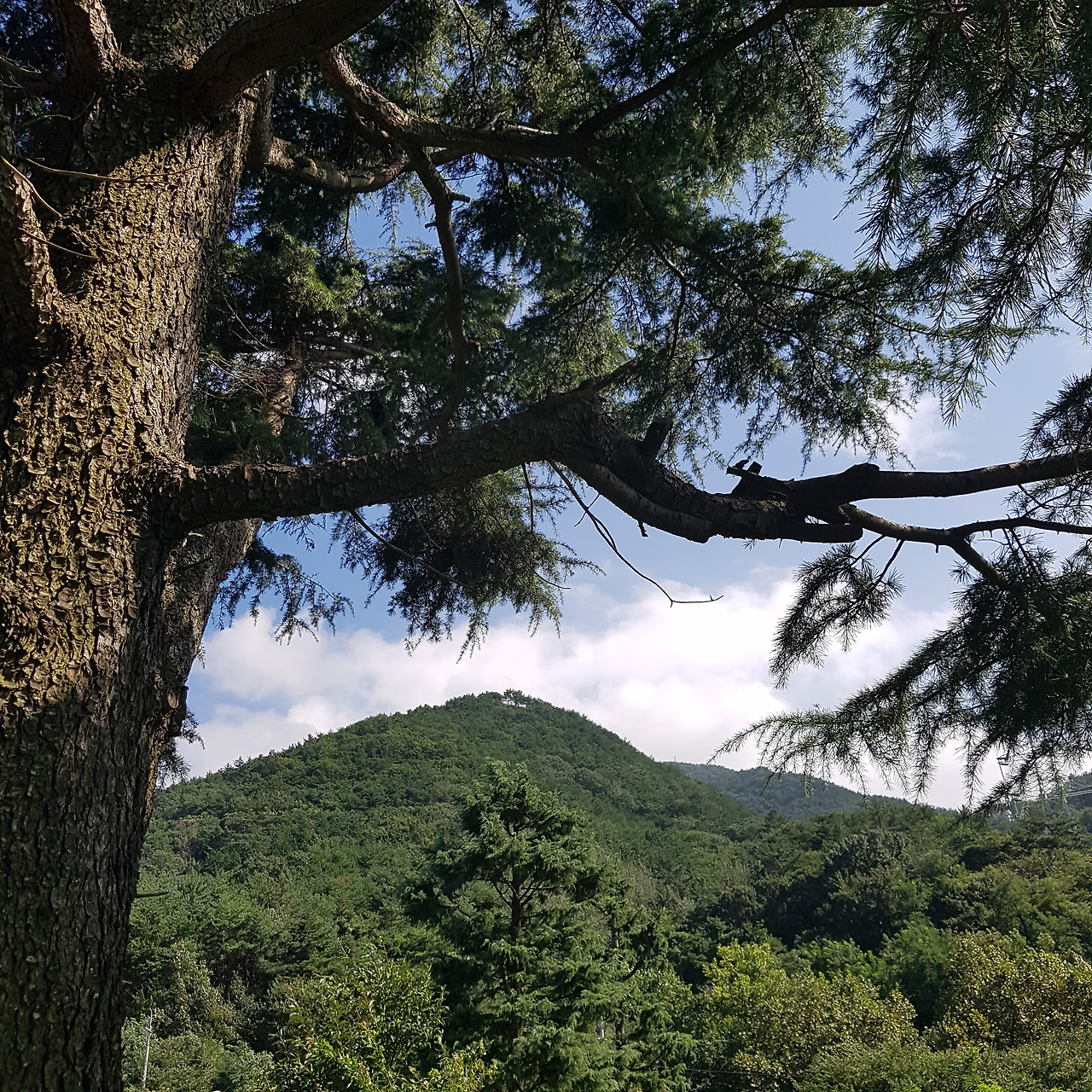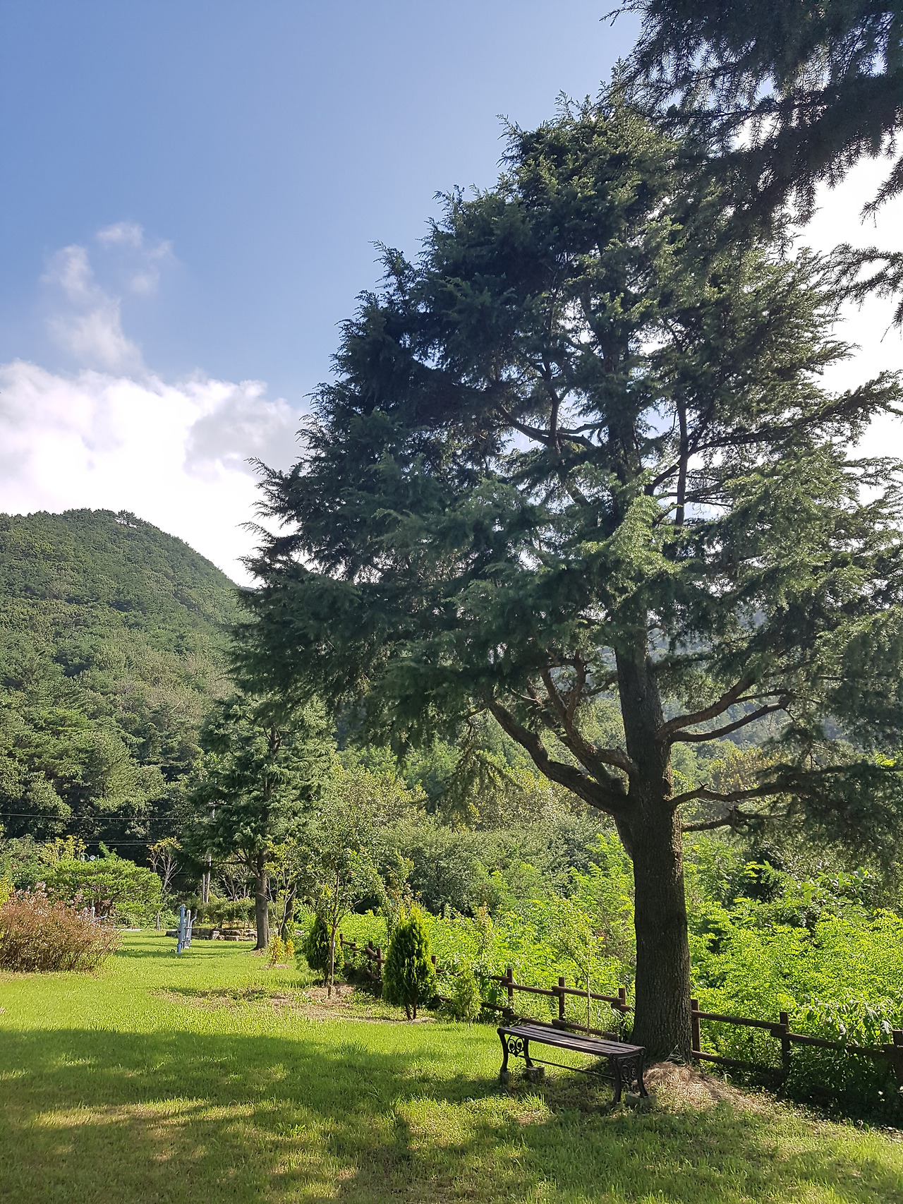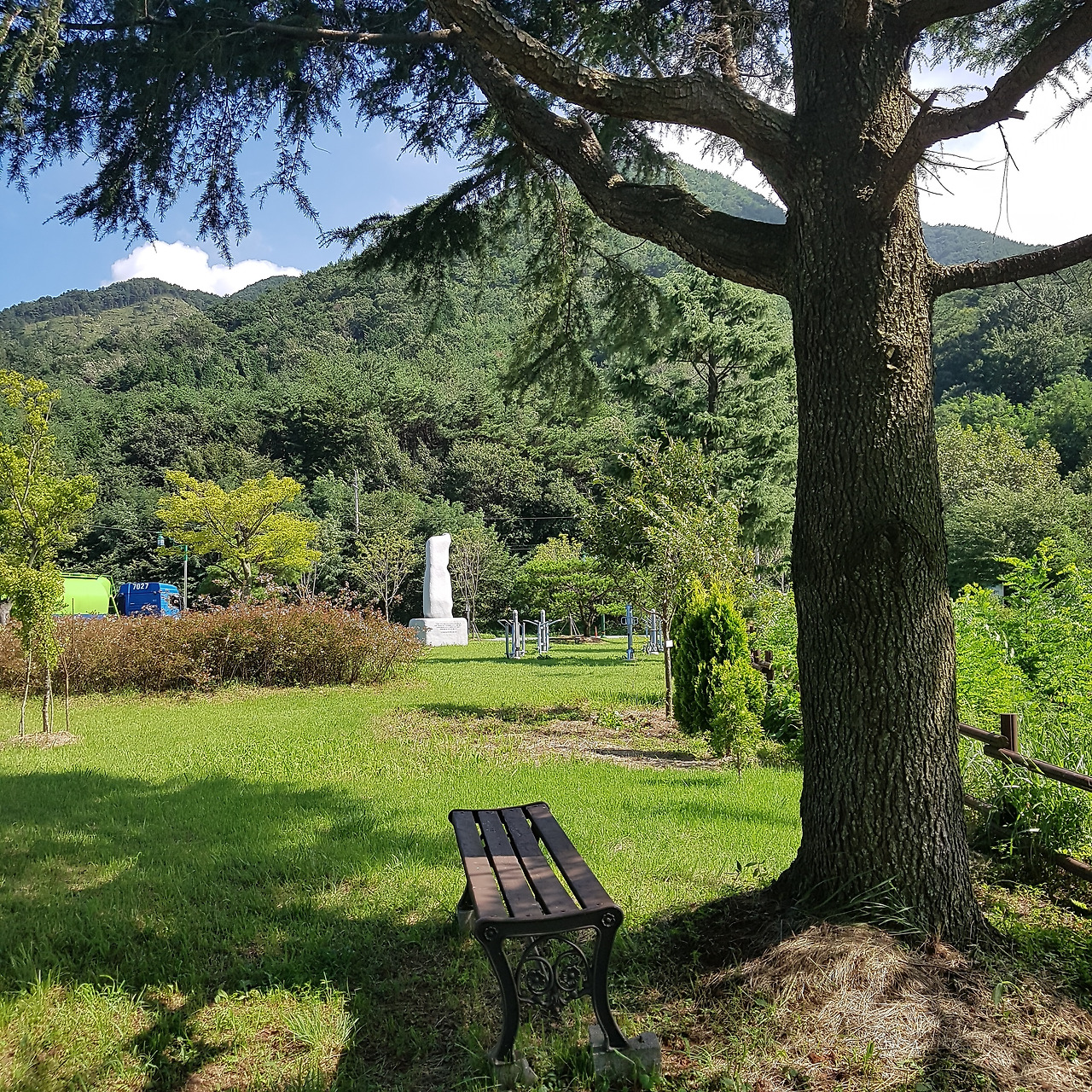 이 나무이다. 고향집에서 보이는 산 중턱에 있는 새로 생긴 공원에 있다. 이곳은 예전에 2차선 고속도로 옆 전망대가 있었던 곳인데, 몇 년 전 4차선 고속도로가 산 아래로 새로 생기고 이 도로는 지방도로로 관리하고 옛 전망대를 개보수하고 확장하여 이렇게 멋지게 만들었다. 이 근처에 고향에서 새로운 관광명소를 만들어서 와보았다가 이렇게 멋진 나무를 또 만났다. 고향의 반려나무 1호는 나무 아래 벤치가 없었는데, 이 나무는 나무 아래 저렇게 아늑한 벤치가 있다.