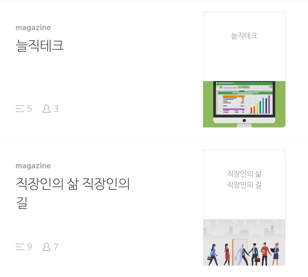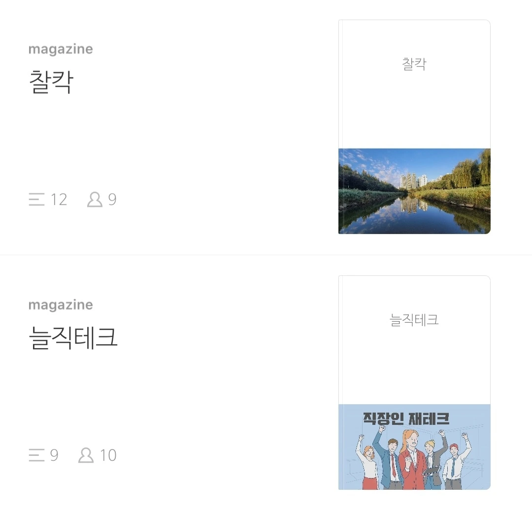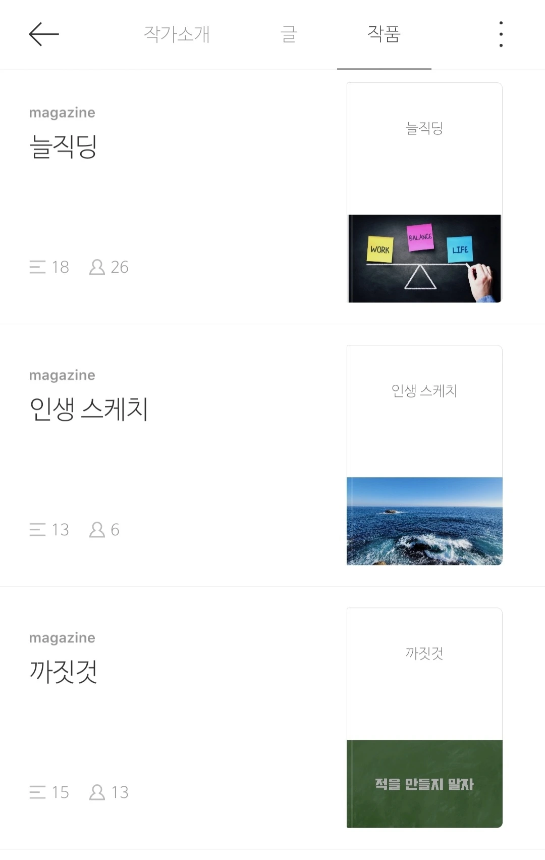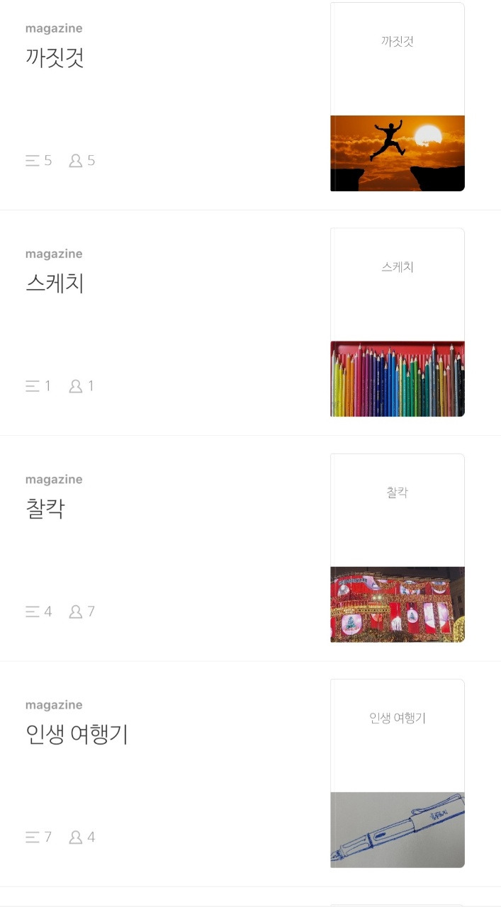 까짓것(자기계발), 스케치(그림), 찰칵(사진), 인생 여행기(에세이), 늘직테크(직장인 재테크), 직장인의 삶 직장인의 길. # 수정(22.4.14 늘직딩으로 바꾸었습니다) 이렇게 총 6개 늘작가 매거진이 있고, 현재 총 31개의 글이 발행되었습니다. 늘 작가가 브런치에 속한 분야는 '직장인의 현실 조언'이었지만, 글을 올리다 보니 다른 분야 글을 올리고 싶은 욕망을 주체할 수 없었습니다. 그래서 잡 브런치가 되는 것을 각오하고 6개 서로 다른 분야 잡지를 발간 중입니다