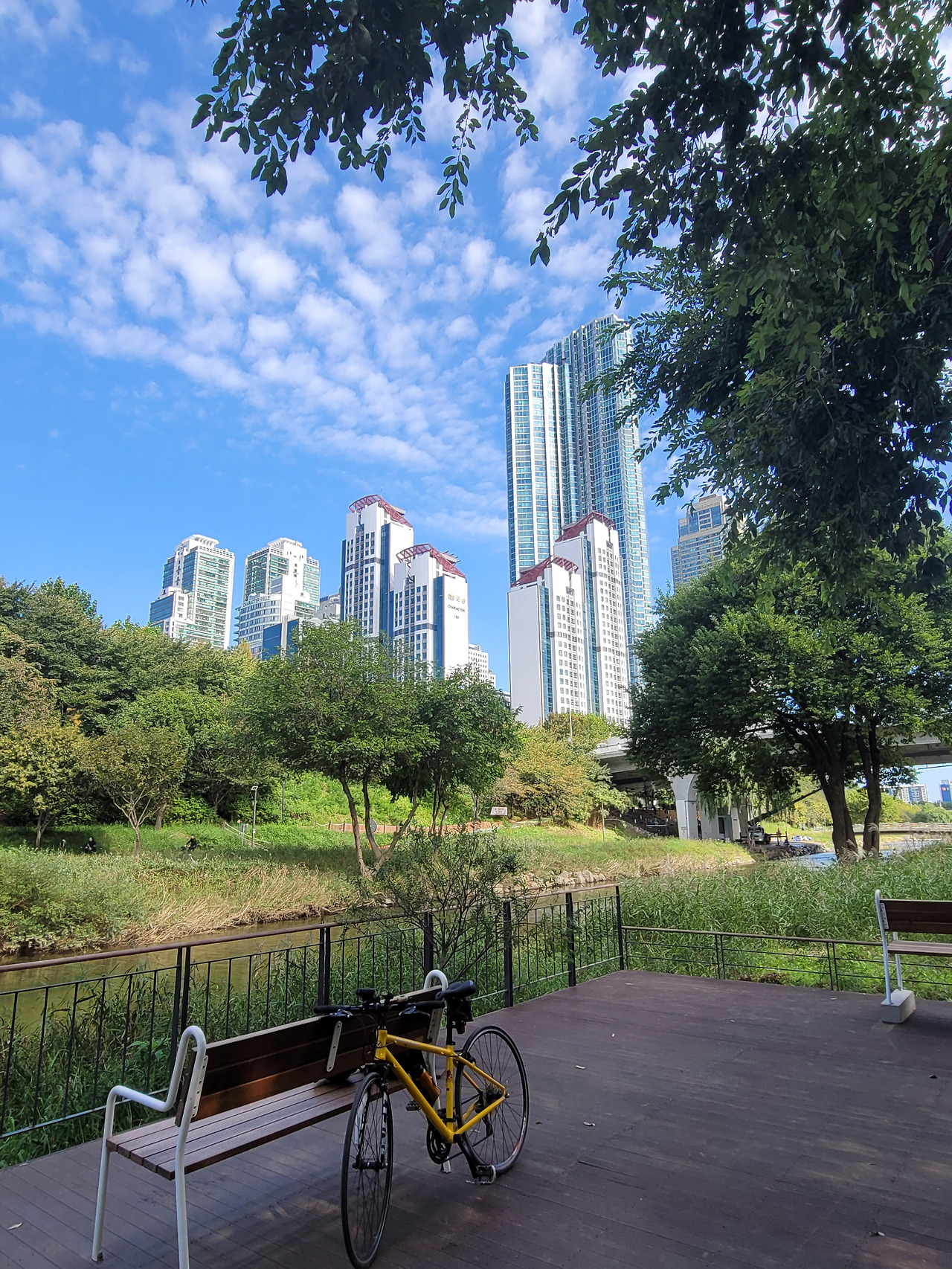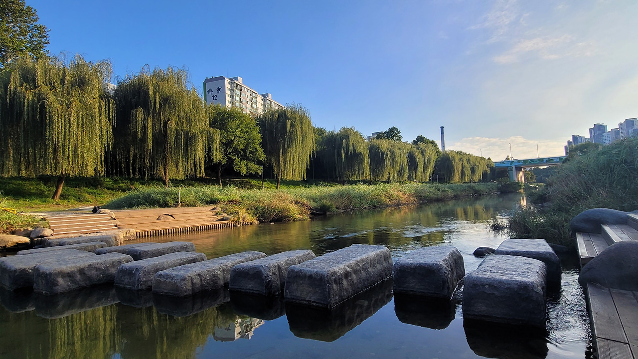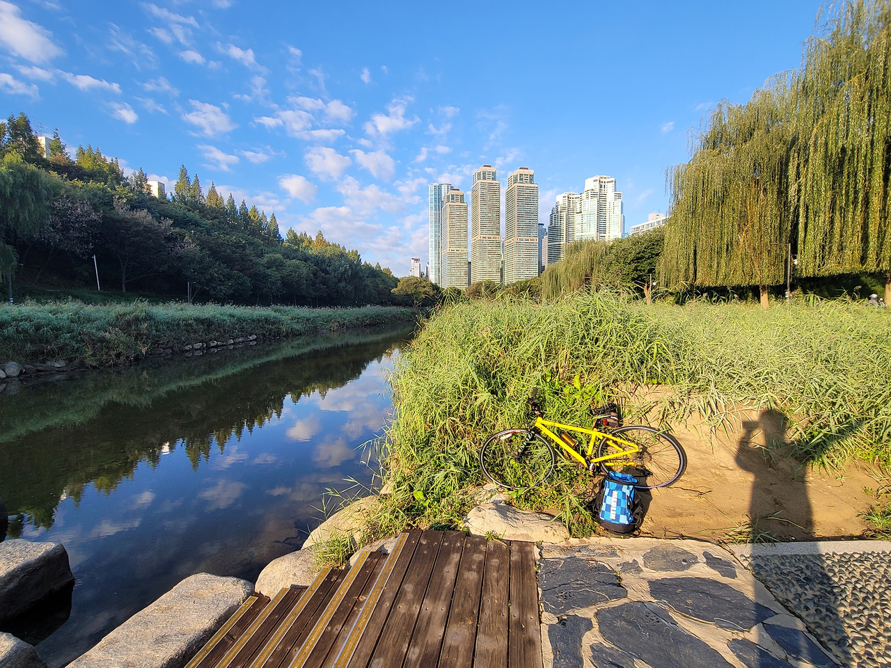 늘작가가 가장 좋아하는 양재천 포토존에서 찍었습니다. 이 날 찍은 베스트 사진은 아니지만 브런치 대문이 긴 가로형에 적합하여 이 사진을 골랐어요. 이곳은 집에서 도보로 몇 분이면 오는 곳인데, 이날은 자전거를 가지고 나왔어요.