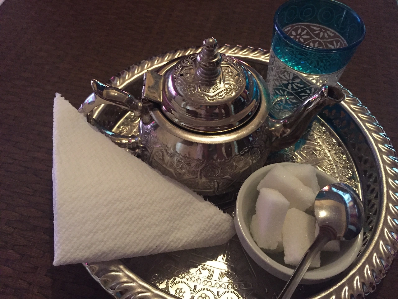 처음 내가 숙소에 도착하자마자 그는 '웰컴 티'라며 모로코 전통차를 건네었었다. 어디에서나 마실 수 있는 이 티는 박하잎을 넣고 설탕을 대량으로 녹여먹는 기본 차로, 단 돈 2 디람 정도로 먹을 수 있었고, 적당한 레스토랑 만가도 무료로 제공되는 차였다. 처음엔 향이 강해 불편했지만, 먹다 보니 굉장히 입에 맞았다.