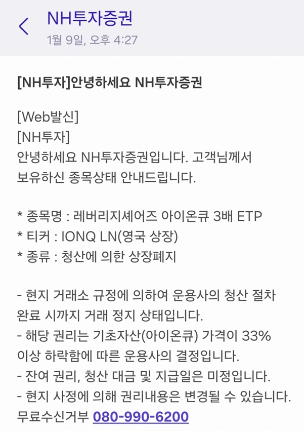 어제 정말 새로운 경험을 했습니다. 갑자기 제가 보유 중인 종목이 상장폐지가 될 것이라는 소식을 들었어요. 처음에는 설마 아니겠지 했습니다. 아래 문자를 받기 전까지는요.