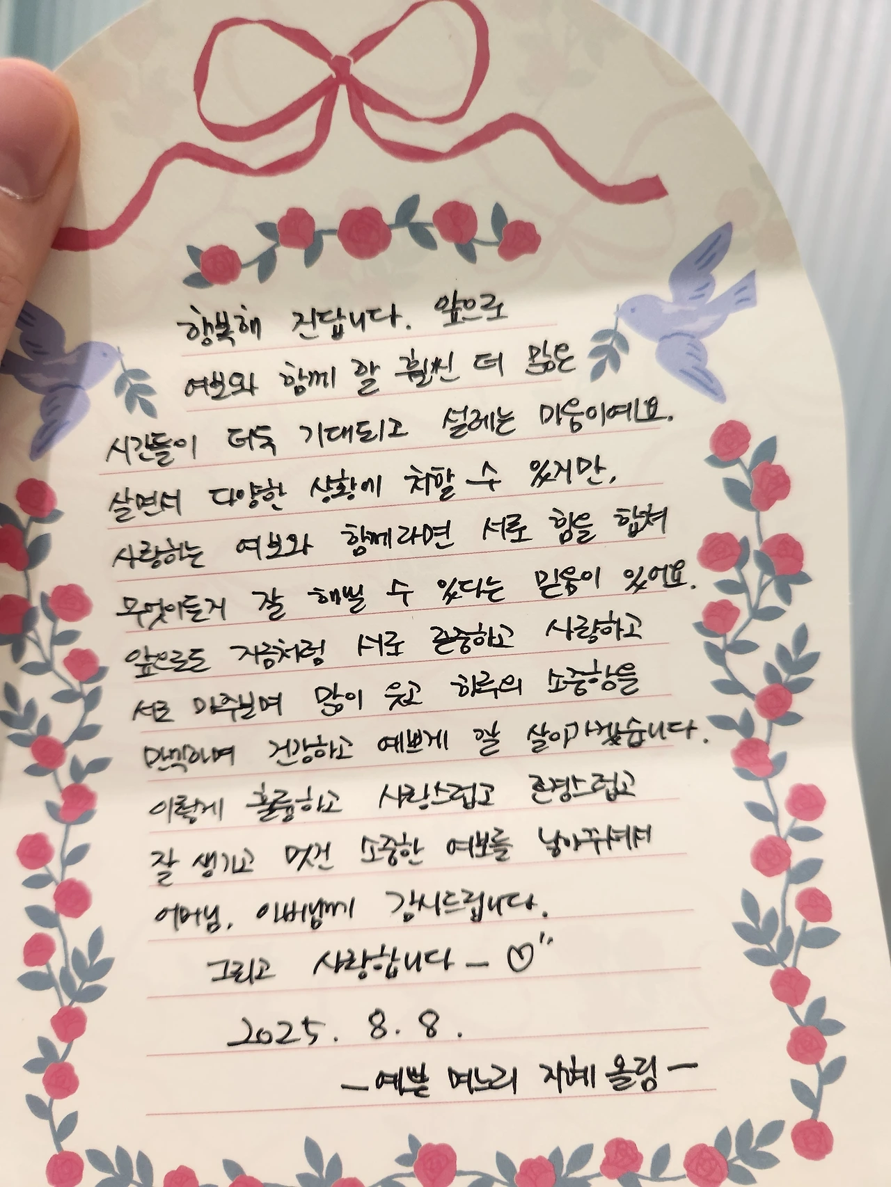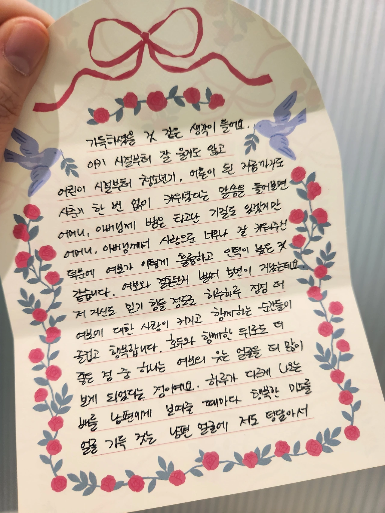 아기 시절부터 잘 울지도 않고 어린 시절부터 청소년기, 지금까지도 사춘기 한 번 없이 키우셨다는 말을 들어보면 어머니, 아버님께 받은 타고난 기질도 있겠지만 또 어머니, 아버님께서 사랑으로 너무나 잘 키워주신 덕분에 여보가 이렇게 훌륭하고 인덕이 높은 것 같습니다.