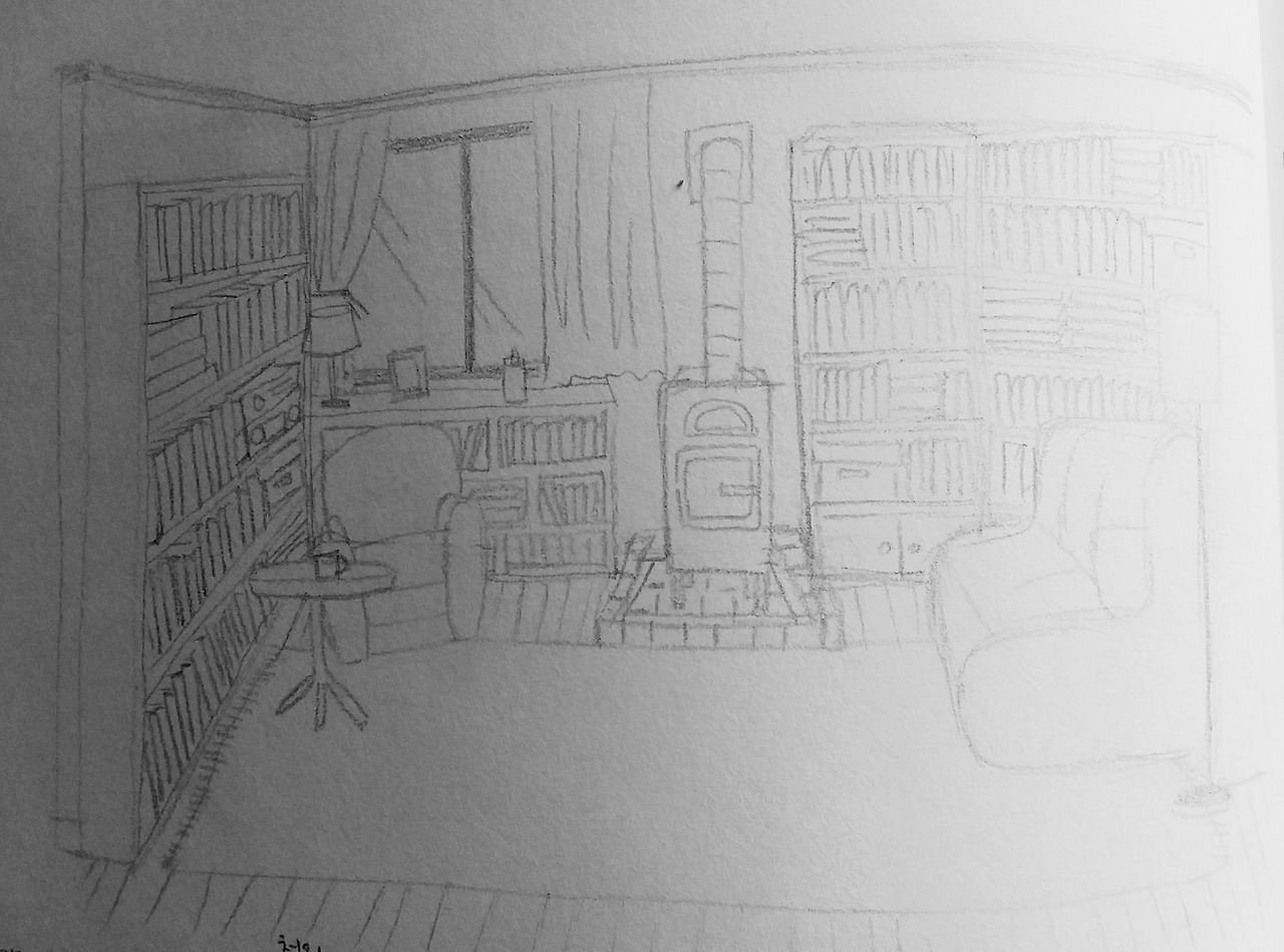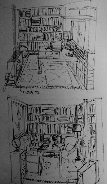 제대로 도면이나 평면 스케치를 배워본 적은 없지만, 삐뚤빼뚤 집 그림을 그리는 건 언제나 즐겁다. 당장 내일이라도 이 상상 속의 집에 들어가 살 것처럼 자세한 동선을 상상하며 그림을 완성해 나갔다. 손님이 집에 들어오자마자 마주하는 건 현관. 조명은 살짝 어둡게, 양 옆으로 높은 선반과 신발장을 두어서 궁금증을 유발하게 하자. 방으로 들어오는 순간 극적인 효과를 높일 수 있겠지. 조명은 모두 간접조명으로 조도를 낮춰서 최대한 아늑해 보이면 좋겠지. 중고로 구한 책과 책장들이 곳곳에 있어서 오래된 책방 같은 분위기가 난다면 좋겠다. 소파는 최대한 낡고 편안한 걸로 두면 친구들이 놀러 왔을 때 부담 없이 앉아 놀 수 있을 거야.