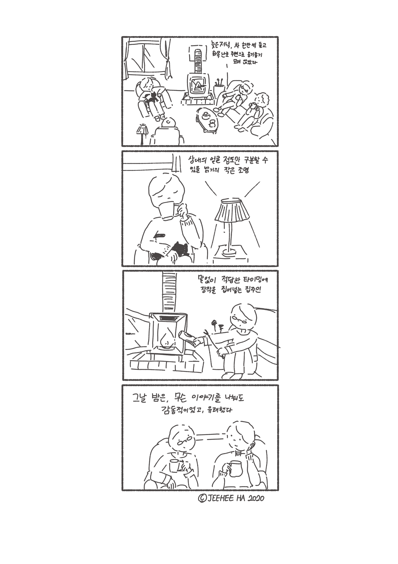 그 후로도 가끔 ‘지인들이 아지트 삼고 싶은 집’을 상상하며 계속 그림을 그렸다. 프랑스 주택 문화에 적응하며 달라진 것 중 하나는 집 스케치에 화목 난로가 추가되었다는 것이다. 어릴 적 살았던 집에도 화목 난로가 있긴 했지만, 그땐 별로 관심이 없었다. 그런데 프랑스의 한 가정집에 초대받았을 때 화목 난로에 홀딱 반해버렸다. 저녁 늦게 차 한잔씩 손에 들고 화목 난로 주변으로 옹기종기 모여 앉았다. 어두운 탁상 조명이 상대의 얼굴 정도만 겨우 구분할 수 있게 비추고, 화목 난로 창 너머로 일렁이는 불꽃이 방을 불그스름하게 밝혔다. 은은하게 깔린 음악 위로 사람들의 수다가 이어지는 동안, 집주인은 말없이 장작을 적당한 타이밍에 집어넣고는 흩뿌려진 재를 무심하게 쓸어 담았다. 그날 밤은 무슨 이야기를 나눠도 감동적이었고, 유쾌한 듯 웃음이 흘러넘쳤다.