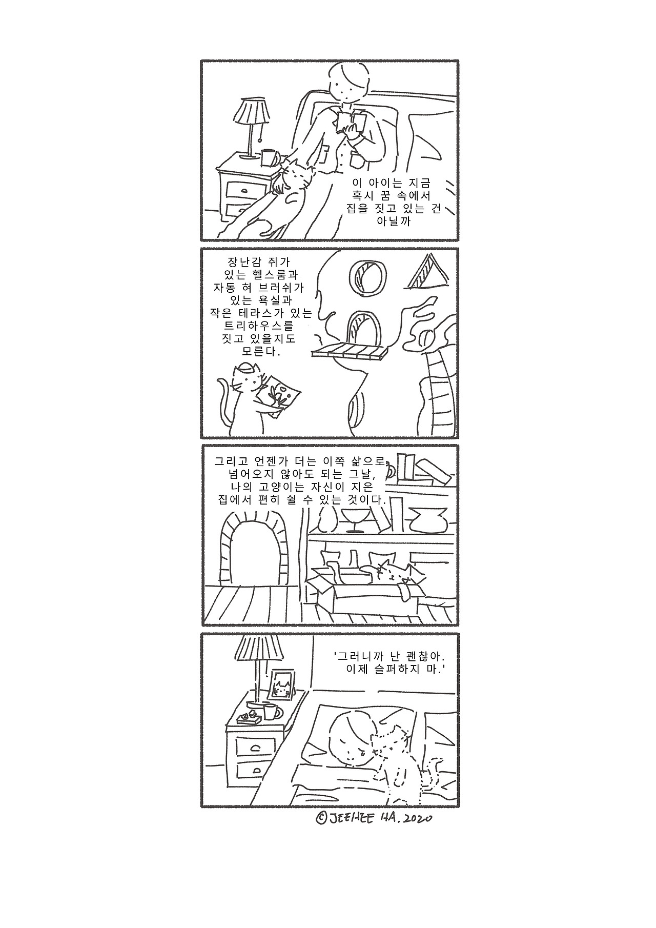 나의 고양이가 지은 집은 어떻게 생겼을까. 높은 곳을 좋아하니까 크고 튼튼한 나무 위에 트리 하우스를 지었을 수도 있겠다. 겁이 많은 아이니까 집을 나무에 밧줄로 꽁꽁 묶어두었어도 이상하지 않을 것 같다. 만약 나무 아래로 개들이 지나다닌다면 무서워도 작은 테라스 하나는 마련해두었을 것이다. 개들이 올라오지 못하는 곳에서 약 올리는 걸 좋아하니까.
