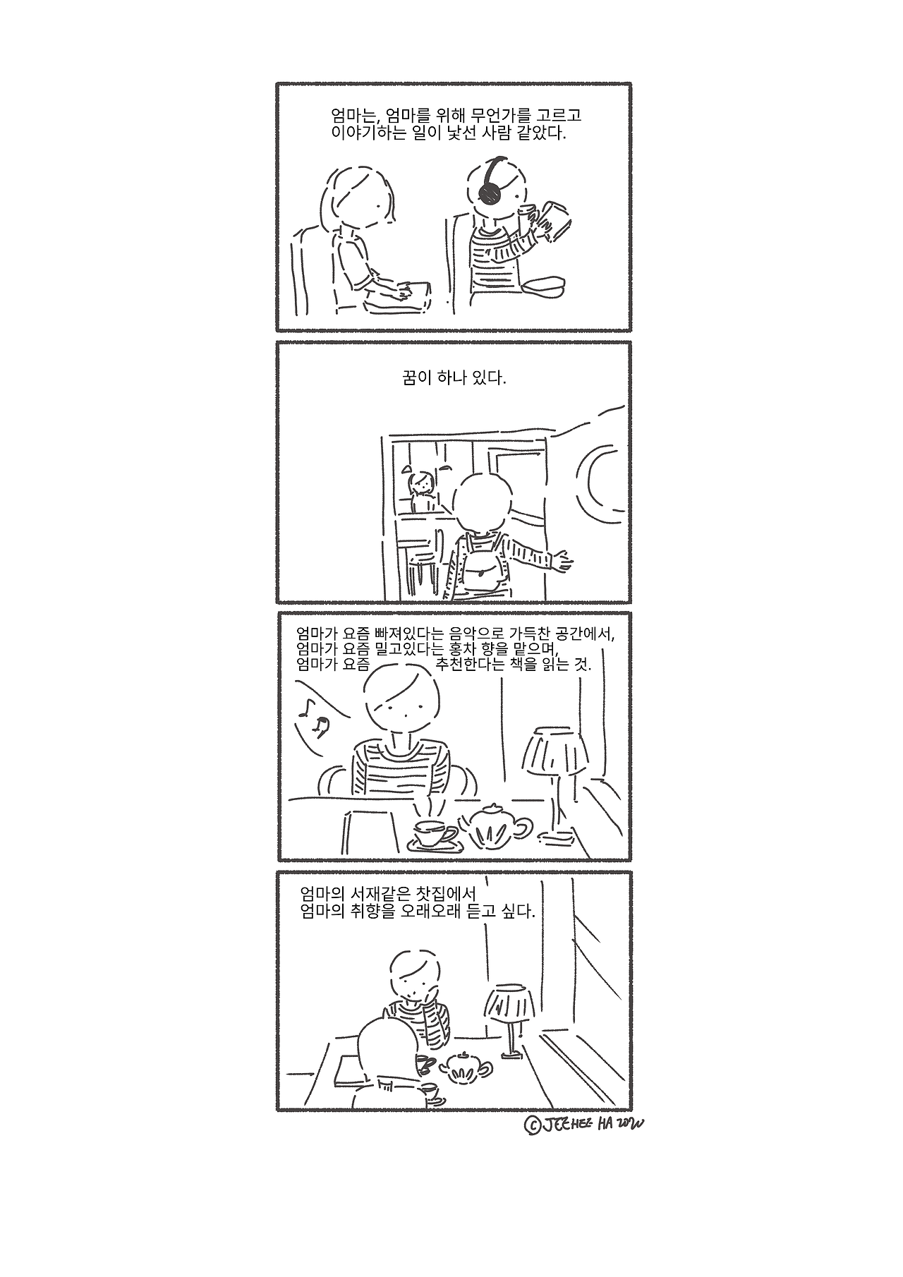 요즘은 꿈이 조금 구체적으로 바뀌었다. 엄마의 찻집에 손님으로 가는 것. 가서, 엄마가 요즘 빠져있다는 음악으로 채워진 공간에서, 엄마가 요즘 밀고 있다는 차를 맛보고, 엄마가 요즘 추천한다는 책을 읽고, 엄마가 요즘 자주 만난다는 단골손님 이야기를 듣고 싶다. 우리 이야기, 아빠 이야기, 가족 이야기 말고, 엄마 이야기를 더 자주 듣고 싶다. 엄마의 취향이 가득 담긴 곳에서 엄마의 이야기를 읽어내고 싶다.
