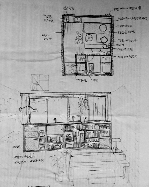 큰 통창이 뚫린 벽에 주방과 책장을 두자. 깊이 70 정도의 넓은 수납장을 통째로 짜 넣는다고 생각하면 된다. 거기에 세면대만 적당히 뚫고 조리는 휴대용 인덕션으로 해결한다. 냉장고는 미니 냉장고를 집어넣거나 아니면 저 멀리 잘 안 보이는 구석으로 숨겨버리면 그만이다(어차피 작은 원룸에 크고 시끄러운 냉장고는 숨기는 게 제일이다). 자주 쓰고 예쁜 그릇은 선반에 놓고 나머지 조리도구는 다른 곳에 두어도 된다. 이제 남은 자리에 책을 잔뜩 꽂는 거다. 핀란드 여행 가서 산 머그잔 세트 옆에 시집 몇 권. 영롱한 무쇠 냄비 옆에 추억의 만화책 한 세트. 예술 작품 같은 와인잔 옆에 황홀한 추리 소설 한 뭉치. 여기에 바깥으로 적당한 풍경이 보이는 통창까지. 크흐.