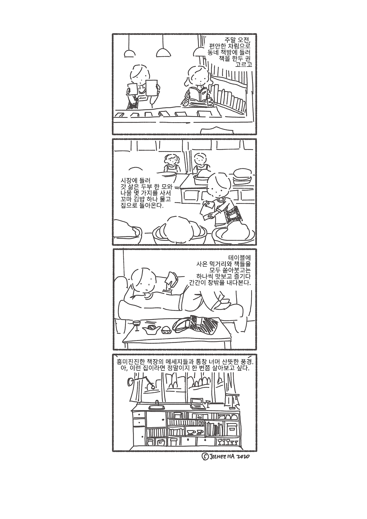 주말이면 슬렁슬렁 일어나서는 간단하게 요기를 하고 편한 차림 그대로 집을 나선다. 먼저 책방에 들러 새로 나온 신간도 구경하고 다른 손님이 사는 책도 기웃거리다 마음에 드는 책 한두 권을 사서 나온다. 시장에 들러 갓 삶은 두부 한 모와 추천받은 나물 몇 가지를 사서 꼬마 김밥 하나 입에 물고 집으로 돌아온다. 테이블에 사 온 먹거리와 책들을 모두 쏟아붓고는 하나씩 맛보고 즐기다 간간이 창밖을 내다본다. 한가한 주말 거리 풍경을 감상하다 지금을 나누고 싶어 지면 근처에 사는 친구 하나를 부른다. 싱크대엔 어제 먹고 놓아둔 그릇들이 몇 개 쌓여 있지만 상관없다. 어차피 흥미진진한 책장의 메시지들과 통창 너머 산뜻한 주말 풍경이 시선을 끌어줄 테니까. 아, 이런 집이라면 정말이지 한 번쯤 살아보고 싶다.