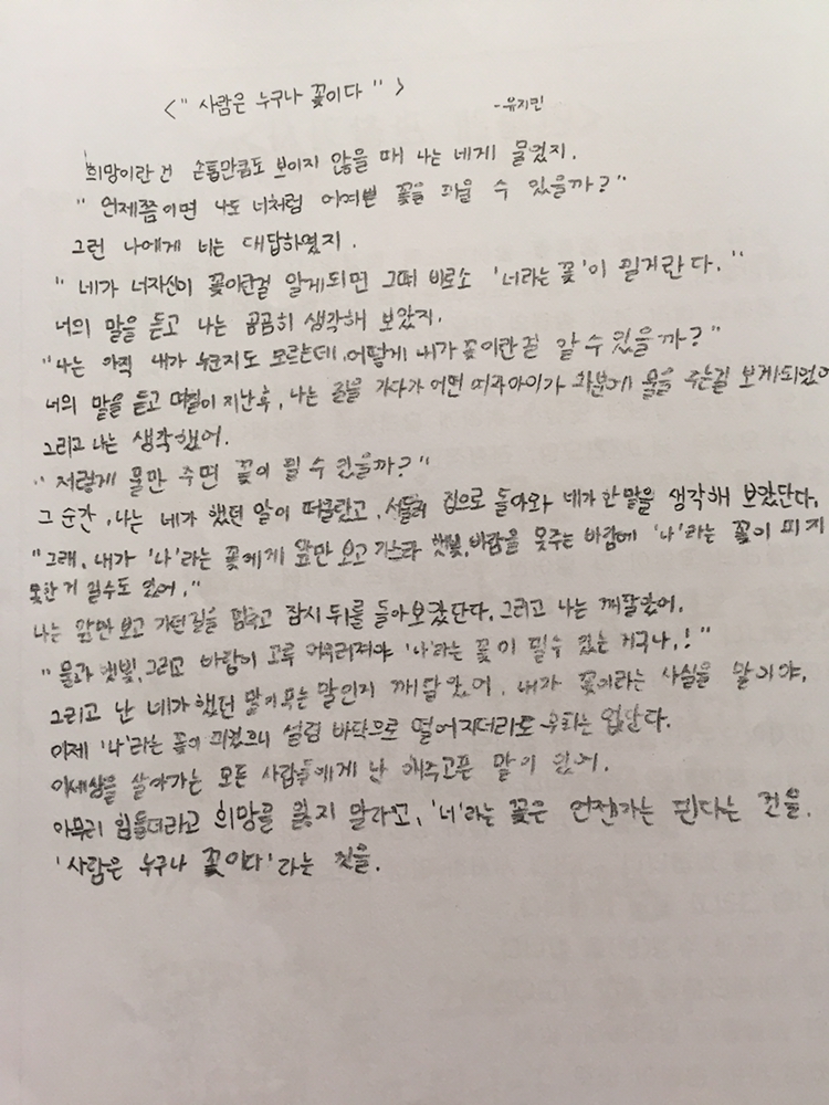 아무리 힘들더라도 희망을 잃지 말라고. '너라는 꽃'은 언젠가는 핀다는 것을. '사람은 누구나 꽃이다'라는 것을.
