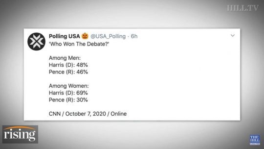 실제로 남녀 유권자들의 반응에도 차이가 있다. 부통령 후보 토론 후 "누가 이겼나" 설문조사를 했는데 남성 유권자들은 해리스 48%/ 펜스 46%, 여성들은 해리스 69% 펜스 38%로 답했다. 즉 똑같은 토론을 봤는데도 남자들이 해리스에 대해 평가가 박했던 거다.