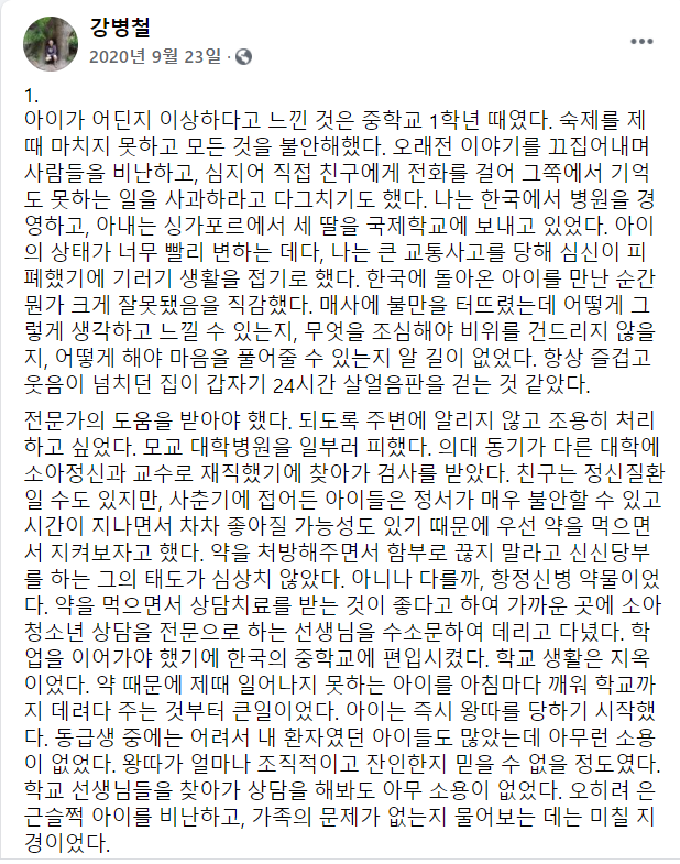 홍 : 강병철 선생님이 페이스북에서 네임드 인플루언서십니다. 문학과 음악에도 조예가 깊으십니다. 글을 너무 잘 쓰시고 식견이 있으시기 때문에 의학에 대한 전문성도 있으셔서 여러가지 글을 읽는 팬분들이 있으십니다. 여러가지 화제가 되는 에피소드가 있지만, 작년에 한겨레 칼럼에 정신질환에 대한 잘못된 표현이 나와서, 강 선생님께서 근거와 함께 조목조목 페이스북에 지적을 쏟아 내셨는데요. 한겨레에 반박 기고를 해보라고 제가 권유드리고 한겨레 에디터와 연결해 드렸어요. 강 선생님의 반박 칼럼이 유명해졌고요.