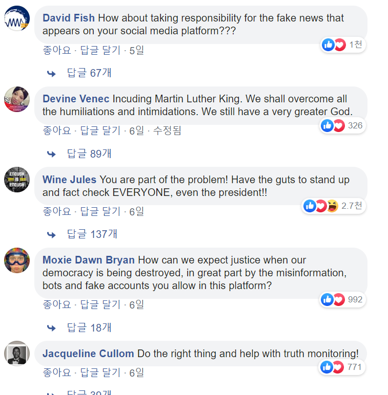 바로 이 포스팅에, 페이스북에서 퍼지는 가짜 뉴스에 페이스북이 제대로 대처하지 않는다는 비판 코멘트가 가장 많은 '좋아요'를 받는 사태가 발생했다. 트위터가 트럼프의 "약탈이 시작되면 총 쏜다"는 1967년 인종차별주의자 발언을 인용한 트윗을 가려 버린 데 비해, 마크 저커버그는 트럼프가 보는 폭스뉴스에 나가서 "우리는 진실의 중재자(arbiter of truth)가 되고 싶지는 않다"며 발을 빼면서 논란이 지속되는 상황이었다.