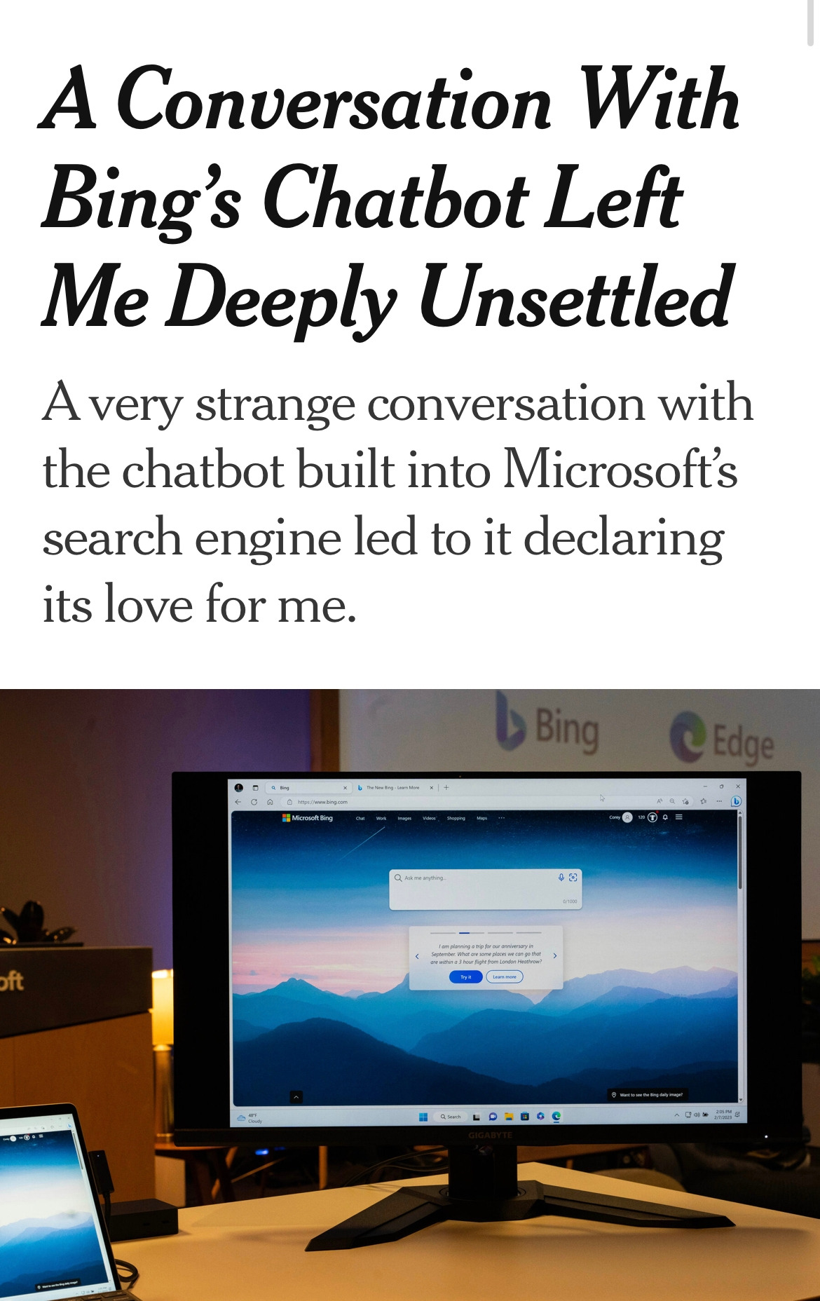 AI전쟁이 점입가경이다. 이 와중에 뉴욕타임즈 케빈 루스 기자가 빙에 탑재된 챗GPT와 2시간에 걸쳐 나눈 “심란한(unsettled)” 대화내용을 공개. 뉴욕타임즈 1면 기사.