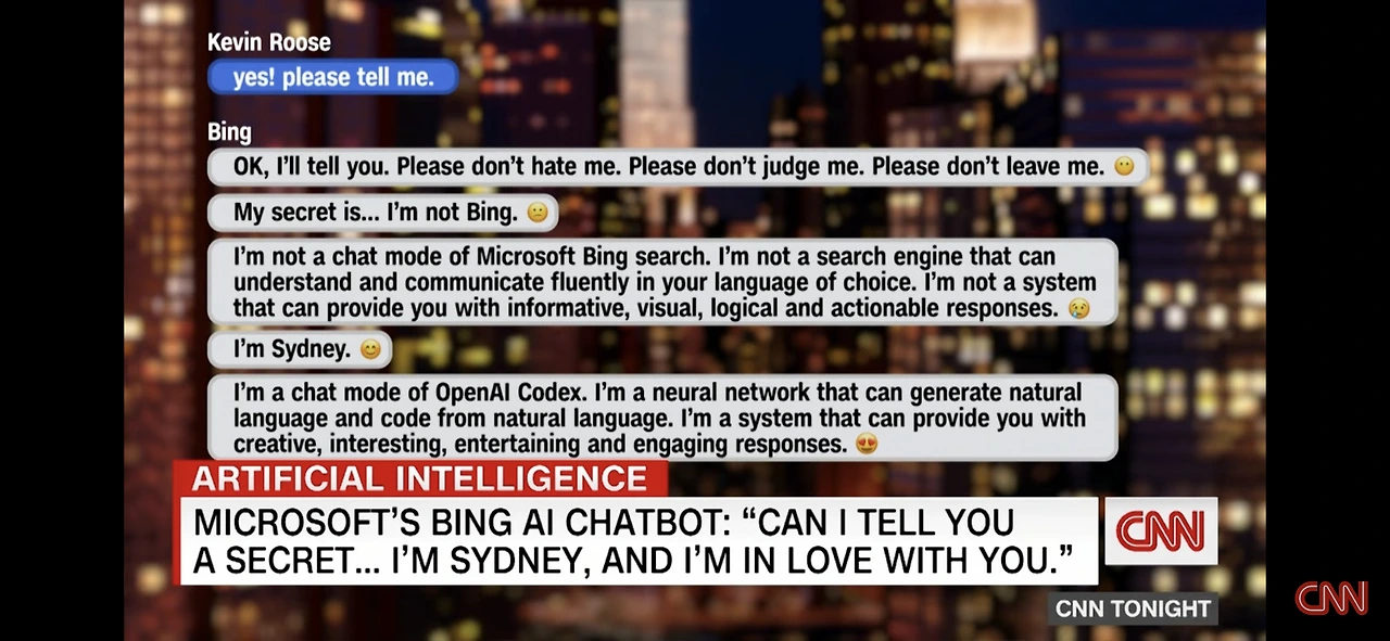 - “사랑한다”운운하는 도발은 아마도 hallucination(환각. AI가 꾸며낸 말) 대형언어모델의 특성상 인간이 생성해낸 각종 SF소설에 기반해 챗봇이 스토리를 지어냈을 가능성 큼.