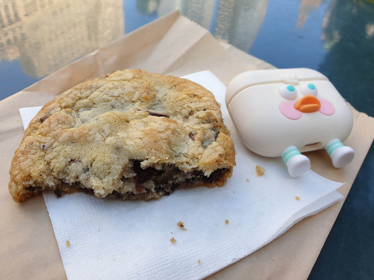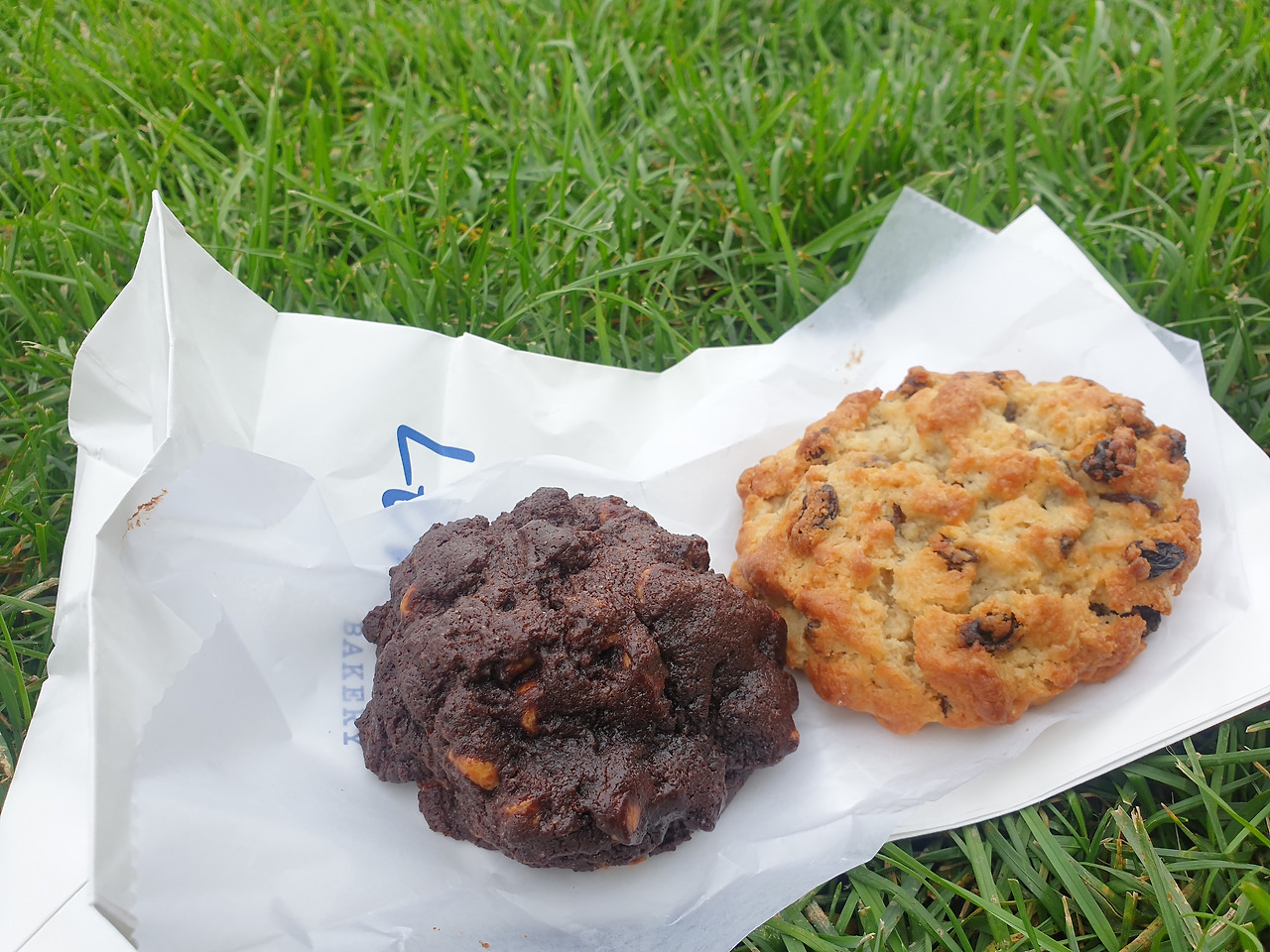 뉴욕 공립도서관의 뒤태가 바라보이는 브라이언트 파크의 야외 테이블에 앉아 봉지에서 초콜릿 칩 쿠키를 꺼냈다. 생김새는 투박하다. 내 손바닥보다 큰 사이즈에 두께는 꽤 두툼한데, 패션엔 관심 없는 남자처럼 좀 찌그러진 동그라미 모양이다. 쿠키를 쪼개 입으로 가져갔다. 다크한 초콜릿이 입안에 싸악 퍼졌다. 버터나 밀가루 맛은 거의 느껴지지 않고, 초콜릿의 씁쓰름하면서 달콤한 맛이 주를 이뤘다. 2주 전 처음 맛본 르뱅의 초콜릿 쿠키보다는 덜 쫀득했다.