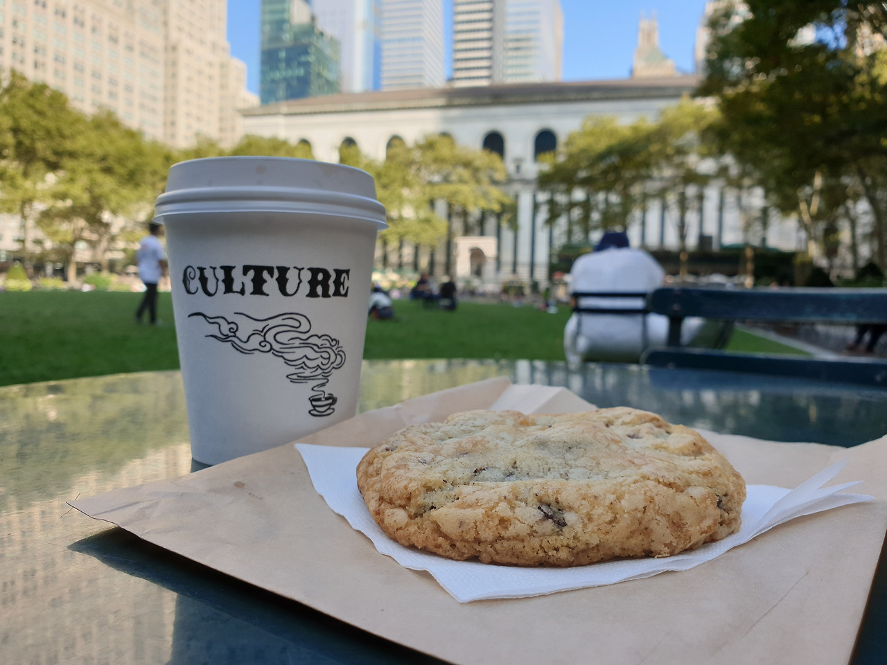 6번 애비뉴와 38번가가 만나는 위치에 자리한 컬쳐 에스프레소. 이곳의 초콜릿 칩 쿠키가 얼마나 맛있길래 쿠키 전문 르뱅 베이커리를 이겨먹었는지 궁금해 찾아왔다. 베이커리 쇼케이스에 쿠키는 딱 두 종류, 오트밀 크린베리 쿠키와 초콜릿 칩 쿠키다. 10여 개쯤 쌓여 있는 오트밀 크린베리 쿠키와 달리 초콜릿 칩 쿠키는 딱 4개 남았다. 초콜릿 칩 쿠키 2개와 코르타도와 주문했다. 신종 코로나바이러스(코로나19) 감염증 사태로 실내 영업이 금지됐기 때문에 테이크아웃해 두 블록 위에 있는 브라이언트 파크(Bryant Park)에 가서 맛보기로 했다. 내 뒤에 뒤에 줄선 남자가 나머지 2개의 초콜릿 칩 쿠키를 사갔다. 월요일 오후 3시. 영업 종료까지 4시간이나 남은 시각에 초콜릿 칩 쿠키가 완판됐다.