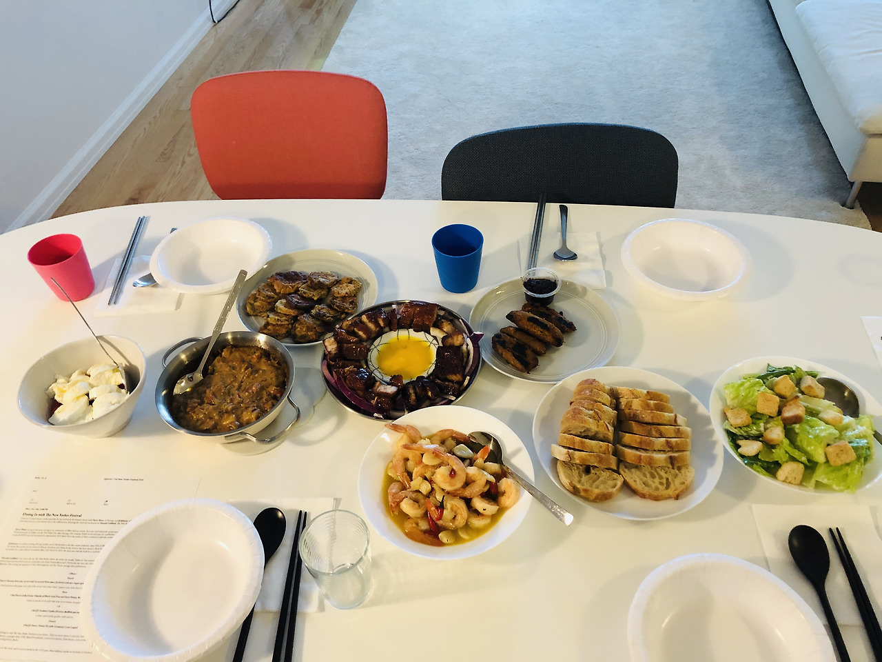 친구 부부까지 초대해 뉴요커 배달음식만으로는 부족하므로 몇 가지 요리를 하기로 했다. 어쩐지 뉴요커와의 요리 대결이 된 셈. 우선 '뉴요커 페스벌과의 식사(Dining In with The New Yorker Festival)' 메뉴는 뉴요커의 음식 당당 기자가 피쳐링하고 할렘에서 활동하는 쉐프들이 요리한 것. 바나나의 일종인 플렌테인(plantain) 튀김과 씨푸드 검보, 그리고 고구마 파이. 여기에 맞서는(?) 내 요리는 챠슈 스타일 삼겹살 구이와 쉬림프 감바스, 애호박전, 시저샐러드, 토마토모짜렐라샐러드. 나는 챠슈가 일본 요리인 줄 알았는데, 싱가포르 사람인 친구 남편이 중국 요리라고 했다.