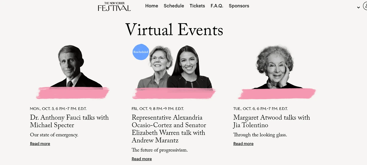 뉴욕에 도착한 지 며칠 안 된 9월 초순, 21년 역사의 '뉴요커 페스티벌'이 올해는 신종 코로나바이러스 감염증(코로나19) 사태로 전면 온라인 행사로 전환돼 열린다는 뉴스가 나왔다(참고). 기간은 10월 5일부터 13일까지. 뉴요커는 매년 가을 정치, 경제, 학계, 대중문화 등에서 이슈가 있는 인물을 초대해 뉴요커 기자와 대화하는 토크 쇼(Talk Show)를 연다. 뉴요커 홈페이지에 지난 페스티벌의 하이라이트 영상이 올라와 있는데, 연사의 열정적 스피치와 관객들의 뜨거운 호응 등 분위기가 꽤 좋아 보였다. 과연 웨비나(Web Seminar)가 이 분위기를 낼 수 있을까.