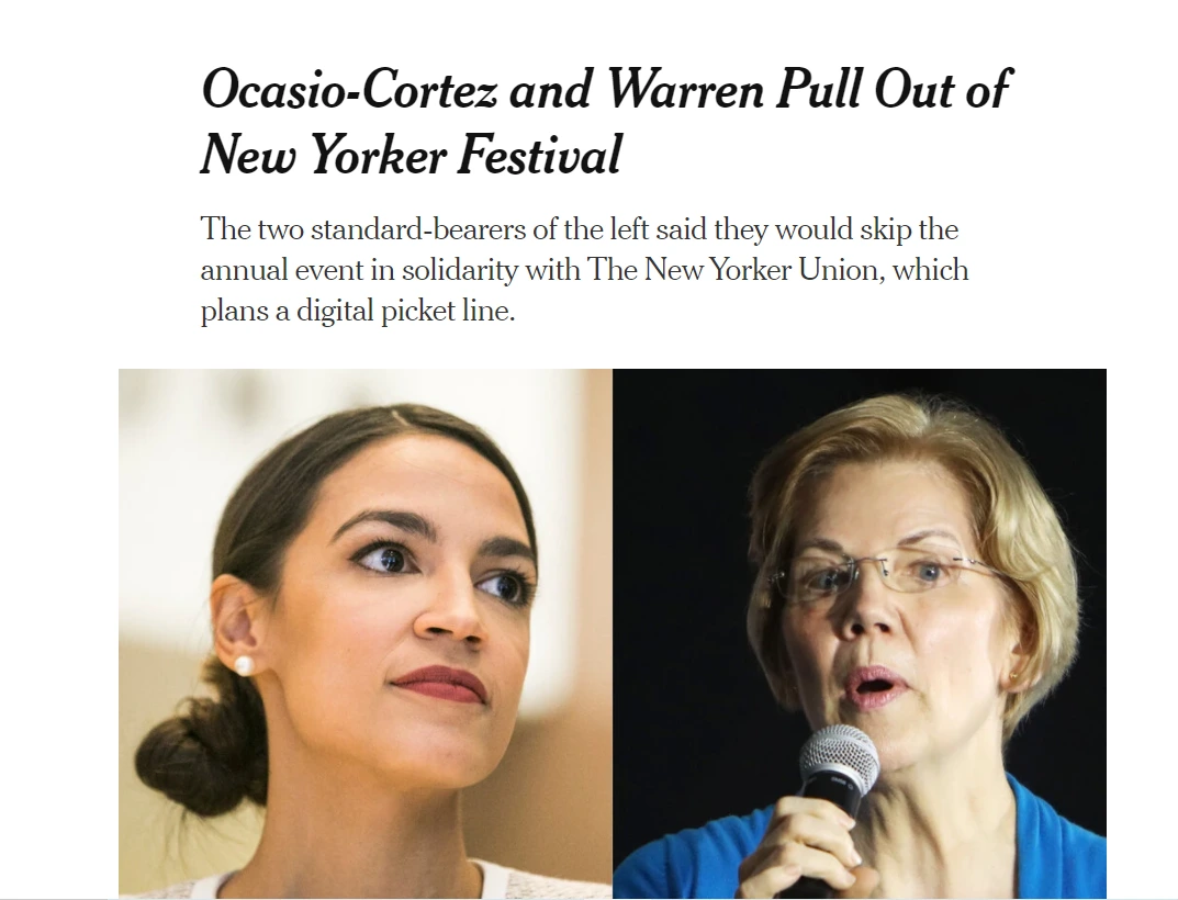 하지만 뉴요커 역시 인간의 조직이라 문제가 없지 않았다. 페스티벌 개막 나흘 전에 이번 페스티벌의 핵심 연사로 꼽히는 AOC와 엘리자베스 워런 민주당 상원의원이 출연을 취소한 것이다. 뉴요커 노조가 페스티벌 개막일인 10월 5일 '디지털 파업'을 결의했는데, 이 두 여성 정치인은 노조의 뜻에 동참하는 차원에서 출연을 취소했다고. 헐. 이러다 페스티벌 안 열리는 거 아냐? 큰 행사 앞뒀으니 경영진이 노조 요구를 들어주지 않겠어? 하는 말을 남편, 친구와 주고 받았다.