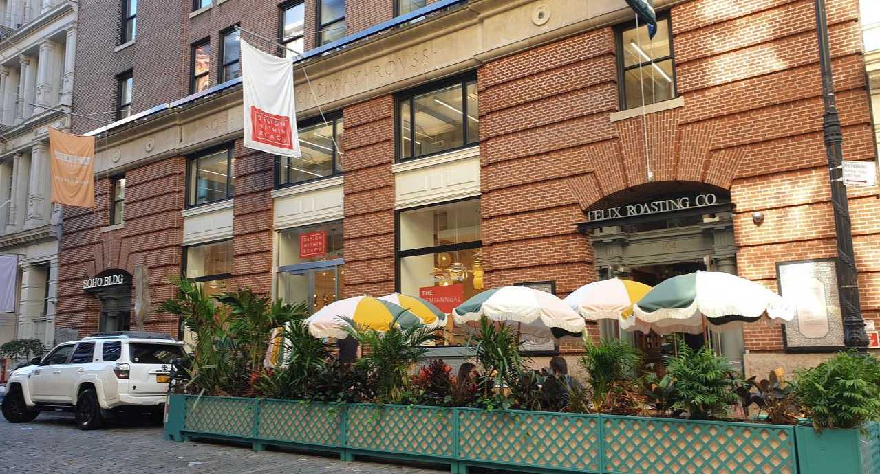 그나마 야외 테이블에 열 명 남짓의 손님이 있어서 ‘살아있는’ 카페 분위기를 냈다. 요즘 맨해튼 식당들은 차별화된 야외 좌석으로 승부하는 중이다. 어퍼웨스트의 한 레스토랑은 야외 테이블을 아예 거대한 버블(비닐로 만든 구형 구조물) 안에 넣어 화제몰이를 했다. 펠릭스의 야외 공간도 순위에 들 만하다. 초록, 분홍, 노랑, 하얀색이 배색된 파라솔엔 솔까지 달려 발랄한 예쁨을 발산했다. 의자에는 꽃무늬 방석을 정성스레 씌웠다. 밝은 청록색 펜스에 초록 식물도 한가득 심어놨다. 발리 해변의 럭셔리 리조트 같은 모습이다. 지정학적(?) 위치상 명품 쇼핑백 몇 개를 내려놓고 커피 마시면 딱 좋은 분위기인데, 아직 이른 시간이라 쇼핑족은 없었다. 대신 개를 끌고 온 동네 사람들이 커피를 마시고 빵을 먹었다.