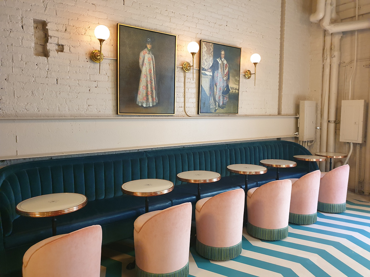 커피가 나오길 기다리며 잠시 둘러본 실내는 사진으로 본 미드타운의 그것과 흡사했다. 청록색 소파에 분홍색 스툴, 금색 테두리의 테이블, 귀족(혹은 왕족)의 초상화, 화려한 상들리에 등등. 하지만 사람의 온기가 없는 럭셔리는 어정쩡하고 쓸쓸했다. 분홍색과 금색으로 치장한 커피바에는 플라스틱통에 든 손소독제가 놓여 있었다. 슬픈 부조화였다.