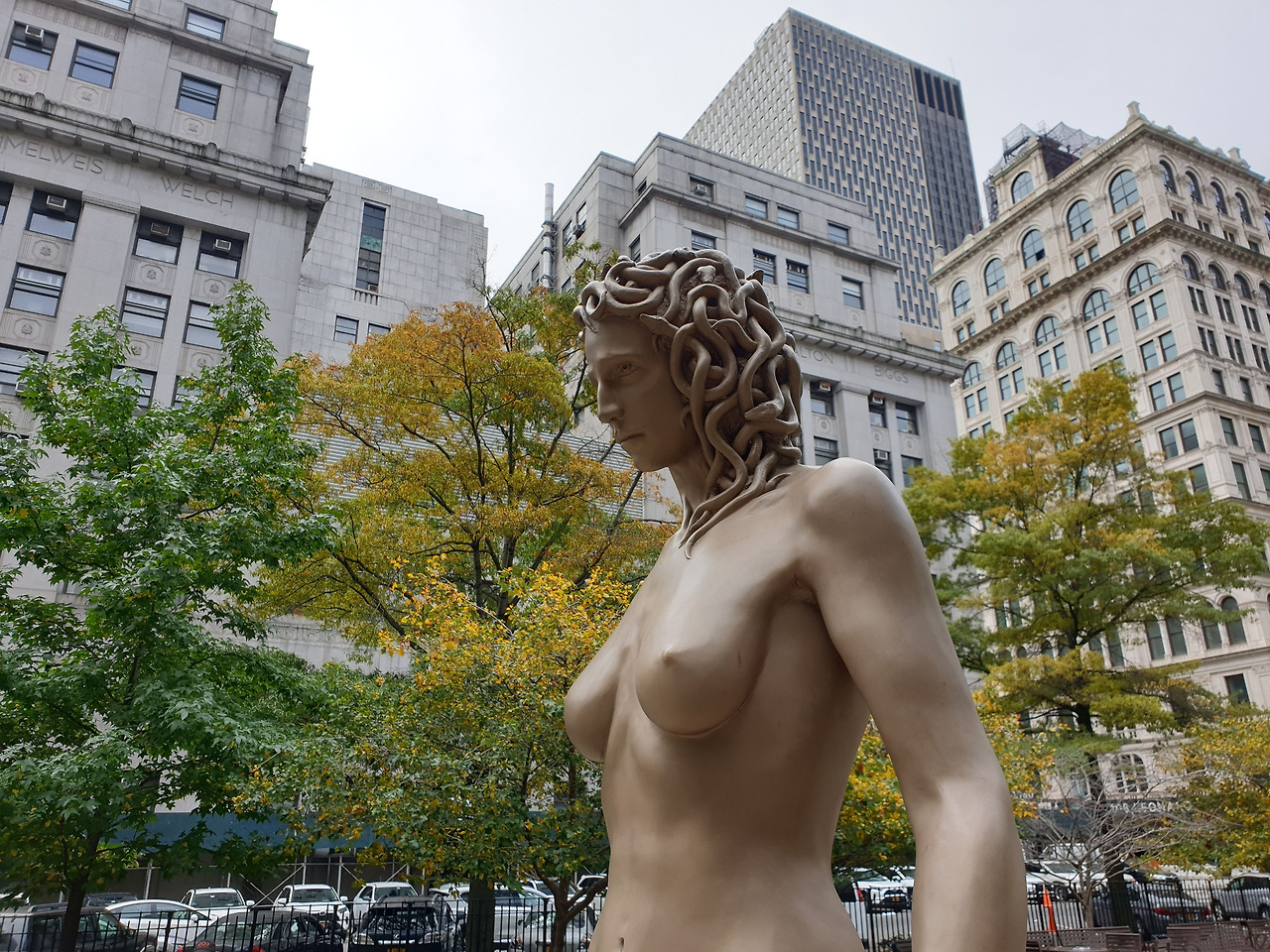 메두사 동상은 성범죄 피해를 딛고 살아남은 여성을 상징한다. 미투운동에 대한 지지의 의미로 최근 이 작품이 형사법원 건너 작은 공원(Collect Pond Park)에 설치됐다. 영구 설치는 아니고 내년 4월까지만 이 자리를 지킬 예정이라고 한다.