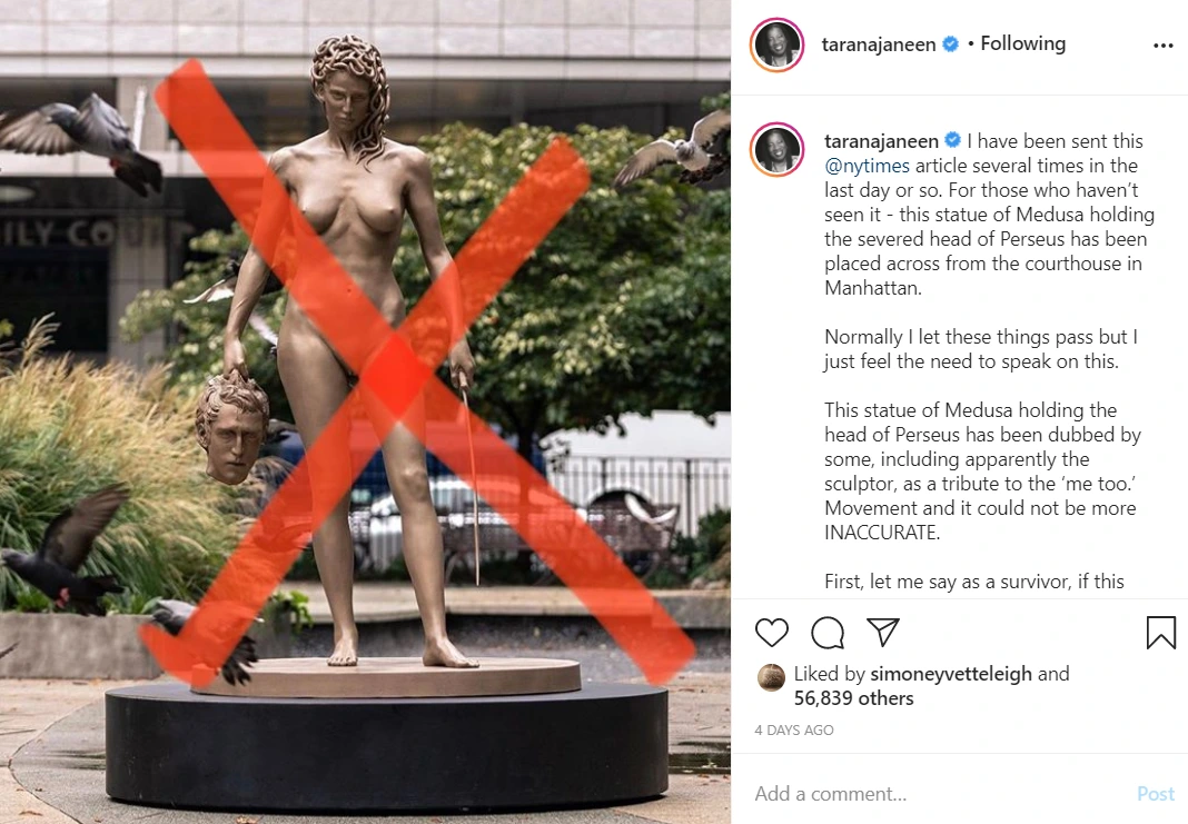 성폭행 가해자는 포세이돈인데, 메두사가 처단한 것은 엉뚱하게도 페르세우스다. 2006년부터 미투운동을 벌여 미투운동의 창시자로 불리는 타라나 버크는 흑인 여성이고, 흑인 여성들이 미투운동에 기여한 바가 큰데, 메두사는 늘씬한 백인 여성의 모습이다. 또 아테나가 메두사에게 내린 것은 형벌이 아니라 스스로를 지킬 수 있는 강력한 힘이라는 해석도 나온다. 타라나 버크는 이 작품에 X자 표시를 한 사진을 인스타그램에 올리며 “미투운동은 가해자에게 복수하자는 것이 아니다. 치유하고 행동하자는 것이다”라고 썼다.