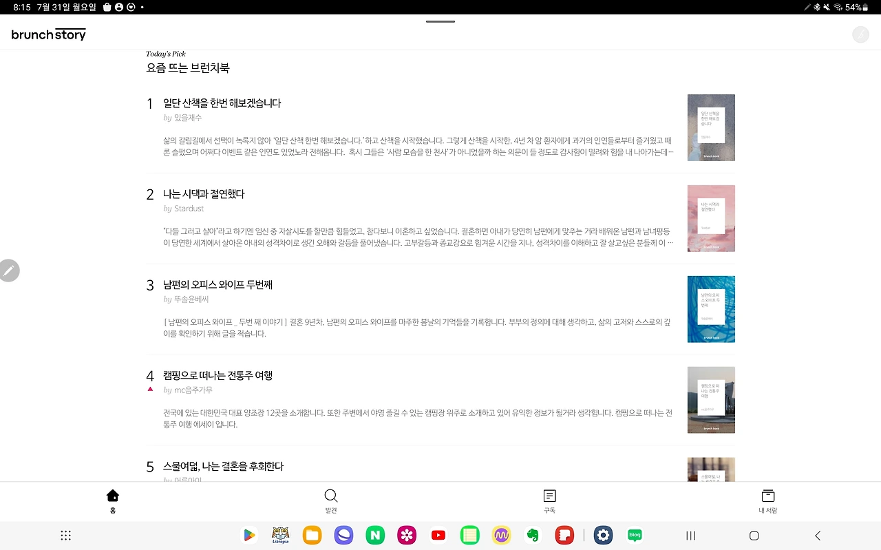이 글을 브런치에 올리러 들어 갔다. 최근뜨는 브런치 북이 보였다.