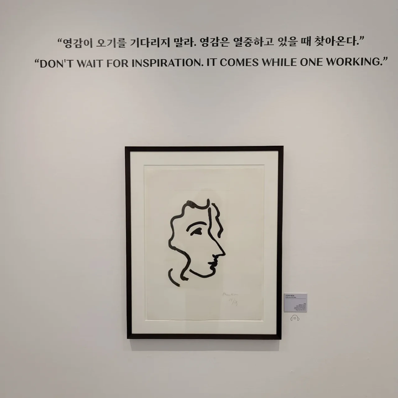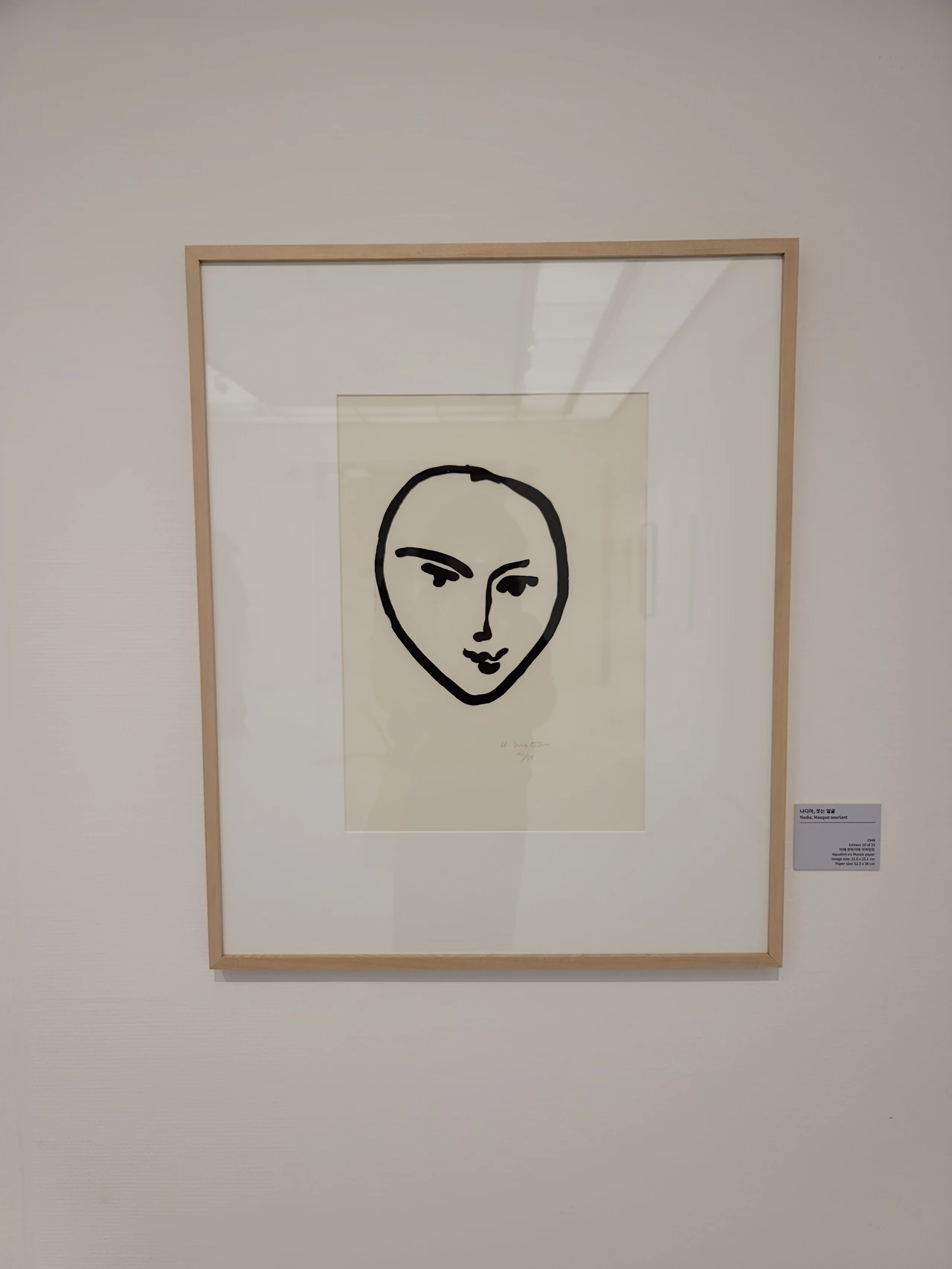 특히 이번에 유일하게 사진 촬영이 가능해서 몇 장 담아 온 작품이 있다. 동판화 '나디아' 시리즈다. 1년 전 첫 번째 전시에서 나에게 흰 바탕에 붓으로 그린듯한 나디아 얼굴이 꽤나 낯설게 느껴졌던 작품이다. 서양 야수파의 거장 마티스가 설마 서예를 한다고? 그만큼 내가 알던 '색채의 마술사' 마티스와 너무 거리가 멀었기에 스쳐지나갔던 그림이었다.