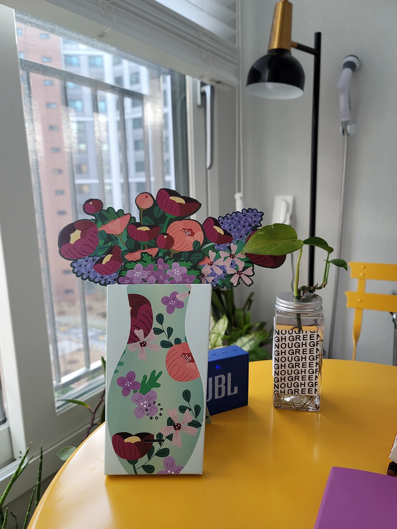일상의 아주 사소한 것에서 감동과 재미를 찾아내는 것. 친구가 주고 간 종이 꽃병을 물끄러미 바라보고 있으니까 문득 내가 이 친구에게 꽤 많은 걸 배우고 있다는 생각이 든다.