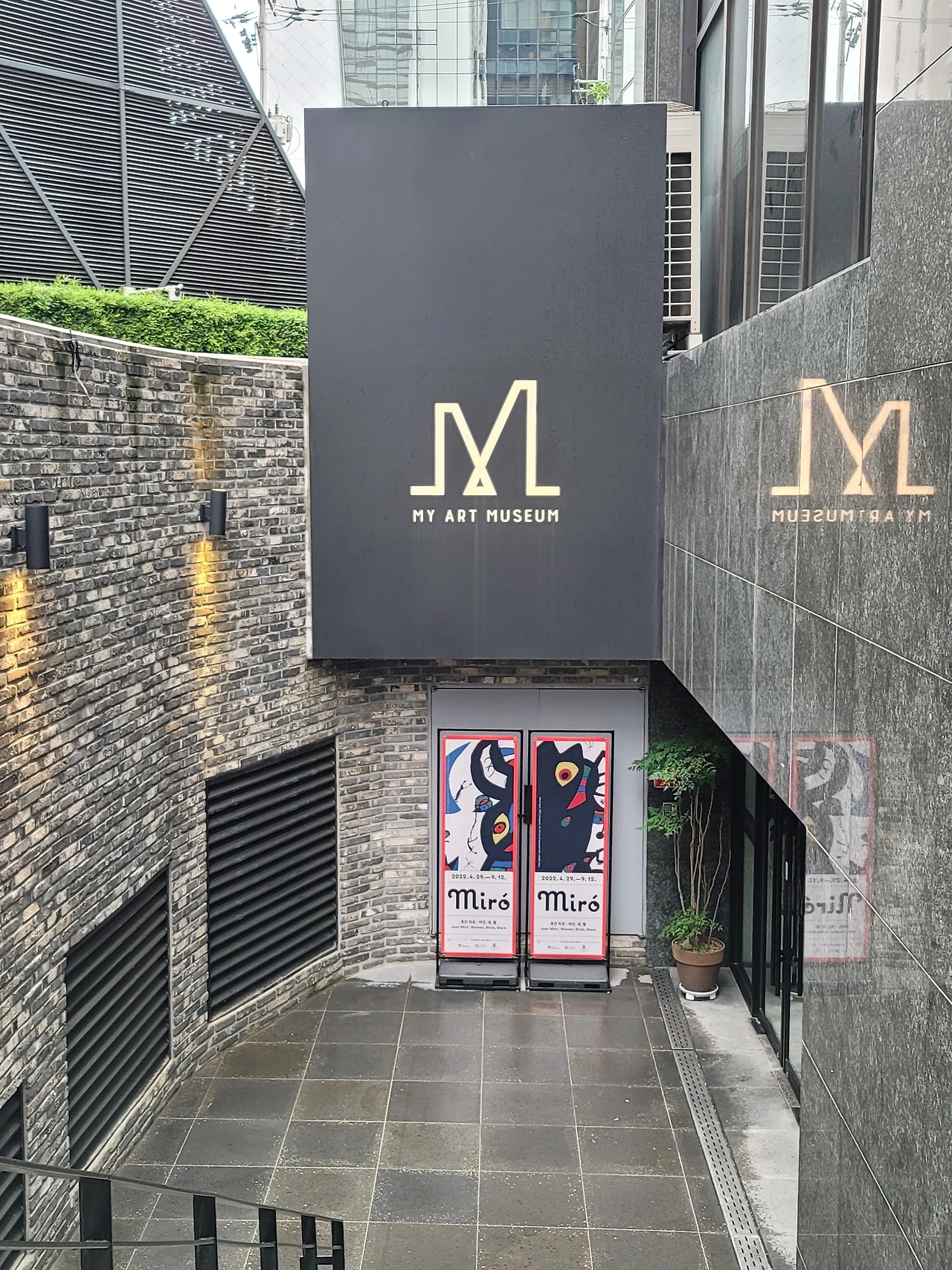 한쪽 벽은 대리석으로 무게감이 있으면서 차분한 분위기를 풍겼다. 안국역 아라리오 뮤지엄 인 스페이스가 담쟁이넝쿨에 파묻혀 있다면 여기 마이아트뮤지엄은 건물을 단단하게 떠받치고 있는 느낌이다. 세련된 색감과 깔끔한 선들로 만들어진 입구 풍경은 비로 씻겨진 공기와 함께 나의 눈을 더욱 맑게 해주었다.