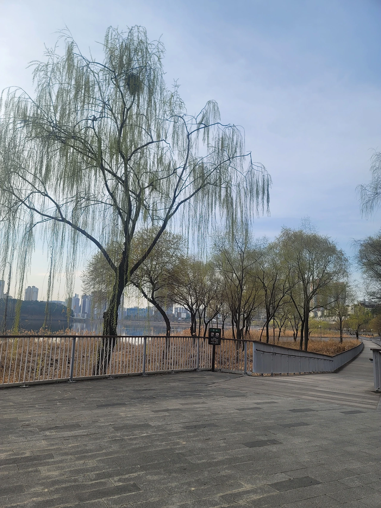 늘어진 버드나무 한그루가 아침 햇살을 배경으로 꼿꼿하게 서있다. 긴 겨울을 견뎌내고 이제 봄을 맞이하는 여유까지풍긴다.