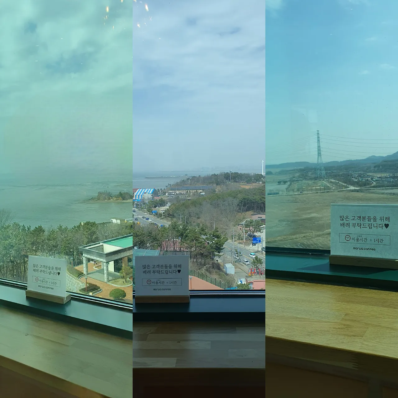 앉아있는 동안 빙글빙글 돌아가는 바닥은 딱 불편하지 않을 정도의 속도로 아주 천천히 움직였다. 섬의 갯벌과 저 멀리 서해 바다 풍경이 잠시 눈앞에 펼쳐졌다. 잠시 후 도로를 사이로 상점들이 즐비한 시가지가 보였다. 그리고 파릇한 해송이 빽빽하게 우거진 야산과 해수가 가득 찬 논인지 밭인 지 헷갈리는 간척지가 눈앞에 나타난다. 쌉싸름한 커피와 달콤한 빵 그리고 천천히 창밖을 스쳐 지나가는 입체적인 섬 풍경까지. 회전카페에서의 1시간은 내가 방문했던 그 어느 섬보다 생동감이 넘쳐났다. 처음에 다소 놀라웠던(?) 커피값이 조금 이해가 되는 순간이었다. 그렇다.