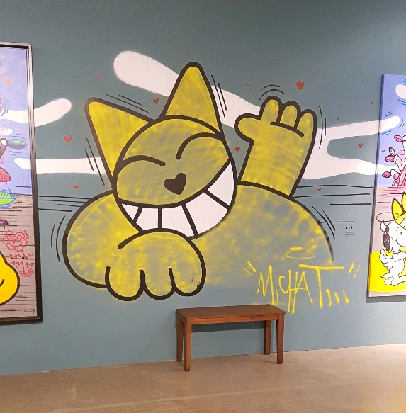 '길고양이'에서 '무슈 샤(M. Chat)'로 길거리 낙서예술가에서 '무슈 샤(고양이 아저씨)'로 전 세계적인 명성을 얻게 된 그라피티 아티스트 #토마 뷔유 (스위스 출생 1977~, 프랑스 파리에서 주로 활동). 그는 길거리 벽면의 엉뚱하고 상냥한 '천진난만' 고양이를 세상과 소통하고 사회적 메시지를 전달하는 '개념 찬' 긍정고양이로 잘 키워 낸 전형적인 성장형 작가다. 불법? 낙서로 감옥에도 가고 벌금도 내고 우여곡절 많았던 이력만큼 그의 '고양이'들은 단순한 유쾌함을 넘어 '그 이상'을 품고 있다.
