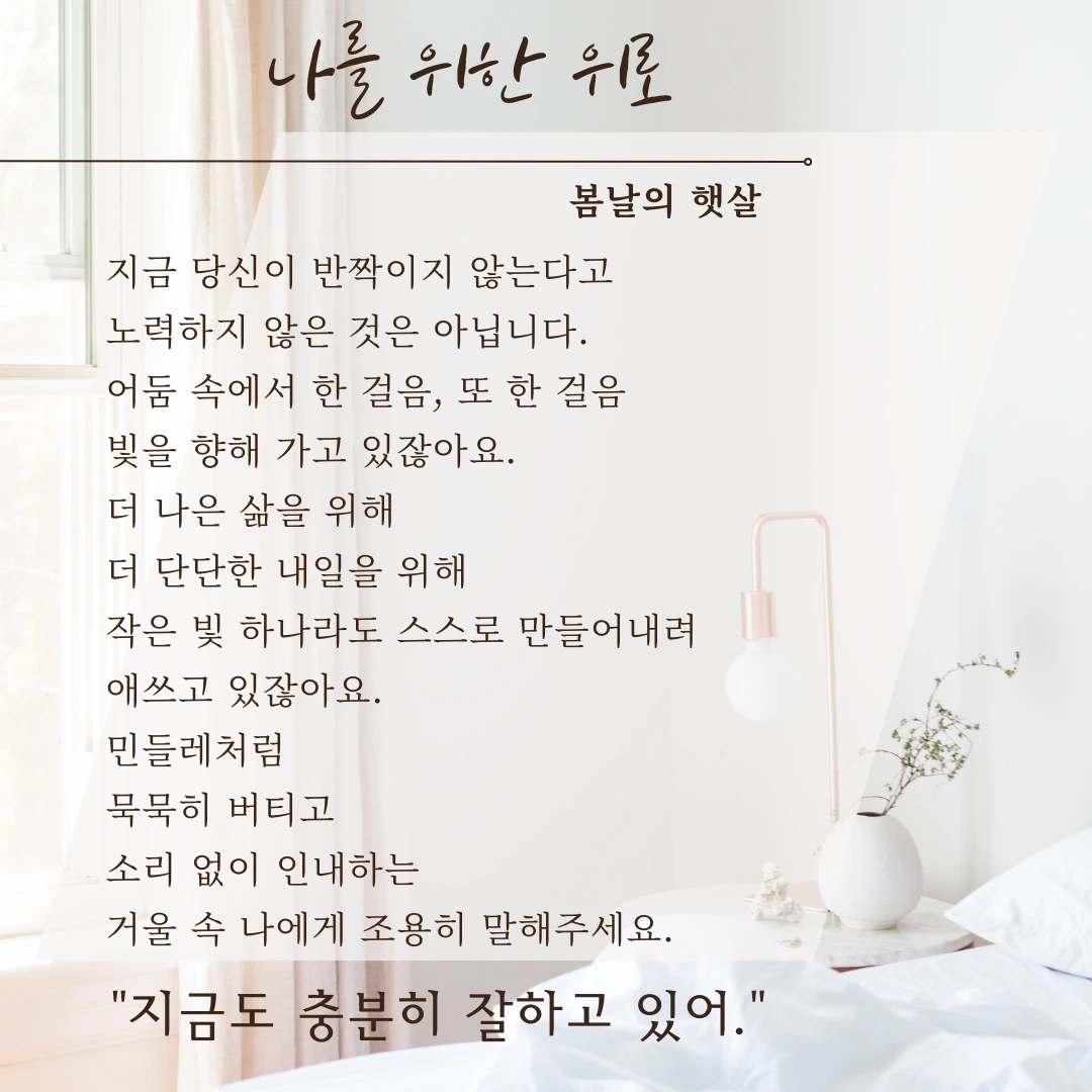 지금 당신이 반짝이지 않는다고노력하지 않은 것은 아닙니다.어둠 속에서 한 걸음, 또 한 걸음빛을 향해 가고 있잖아요.더 나은 삶을 위해더 단단한 내일을 위해작은 빛 하나라도 스스로 만들어내려애쓰고 있잖아요.민들레처럼묵묵히 버티고소리 없이 인내하는거울 속 나에게 조용히 말해주세요.