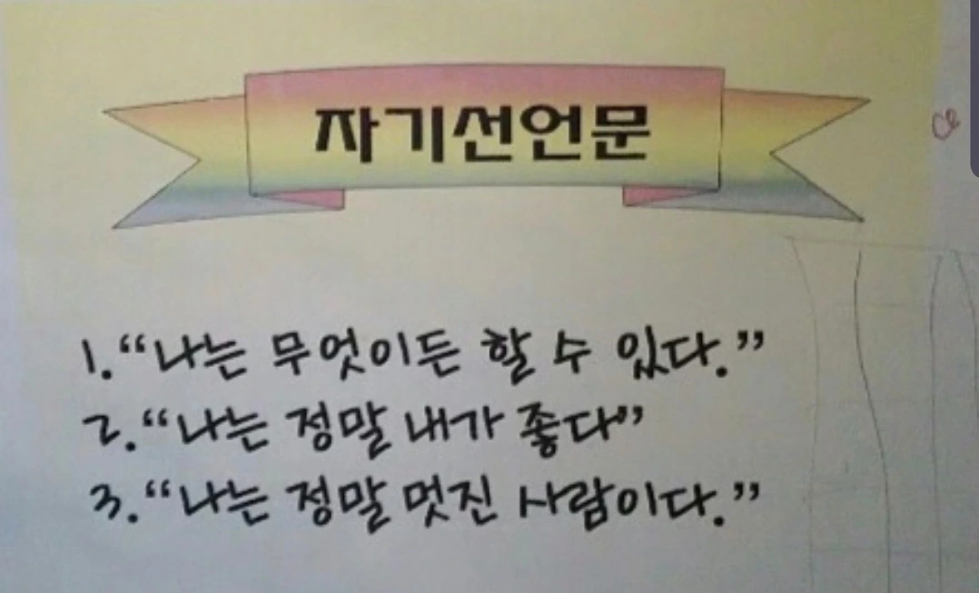 그리하여 영문도 모르는 우리 아이는 초등학교 시절, 매일 아침저녁으로 자기 선언문을 읽었고, 그 문구를 아이 방에도 붙여 두었다.