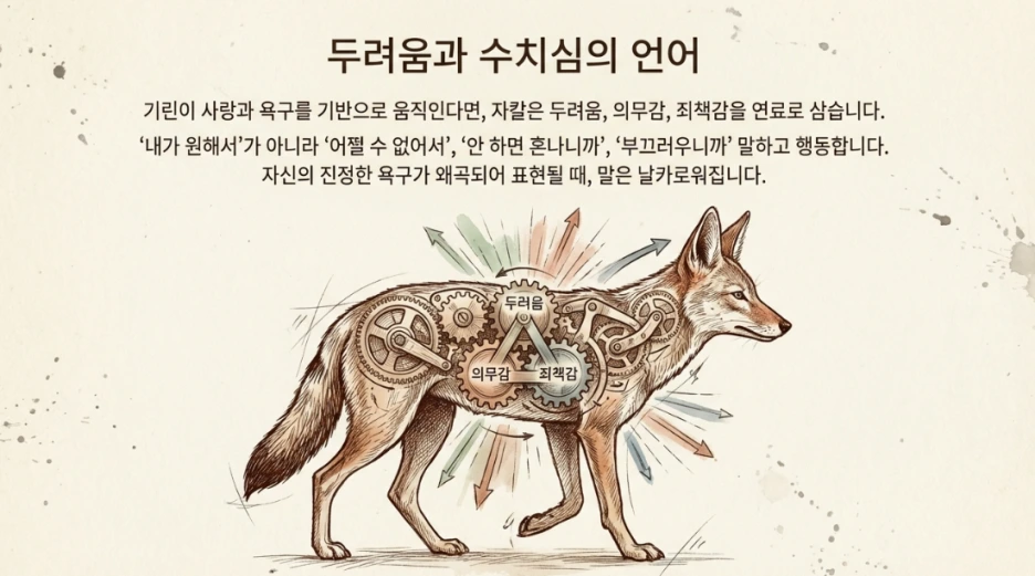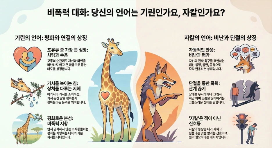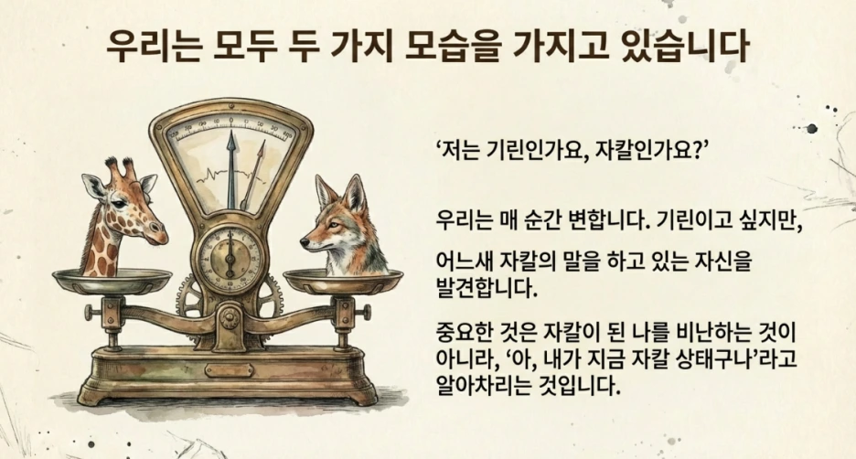 우리 안에는 기린과 자칼이 함께 삽니다. 비폭력 대화는 자칼을 없애는 게 아니라, 자칼의 신호를 알아차리고 기린의 언어를 선택하는 힘을 기르는 것입니다.