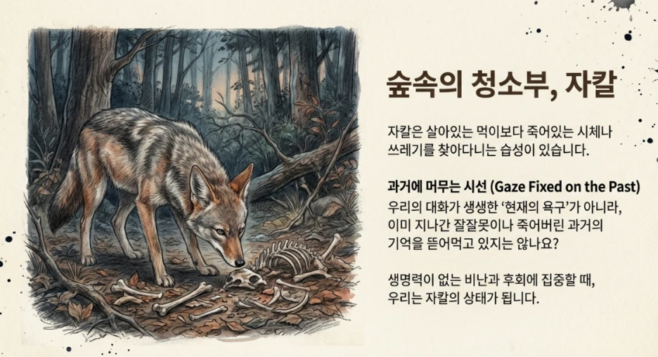 그렇다면 자칼은 무엇일까요. 자칼은 썩은 고기를 찾아다니는 동물입니다. 비폭력 대화에서 자칼의 언어는 비난, 수치심, 과거의 원망처럼 관계 속에서 이미 죽어버린 것들을 파헤치는 말을 의미합니다.
