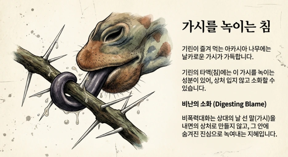 이런 말들이 가슴에 박힙니다. 그 상처로 우리는 더 날카로운 말을 돌려주고 싶어집니다. 하지만 기린의 지혜를 기억해 봅니다. 가시 돋친 말이 날아와도, 그것을 내 안에서 부드럽게 녹여낼 수 있다면 어떨까요.
