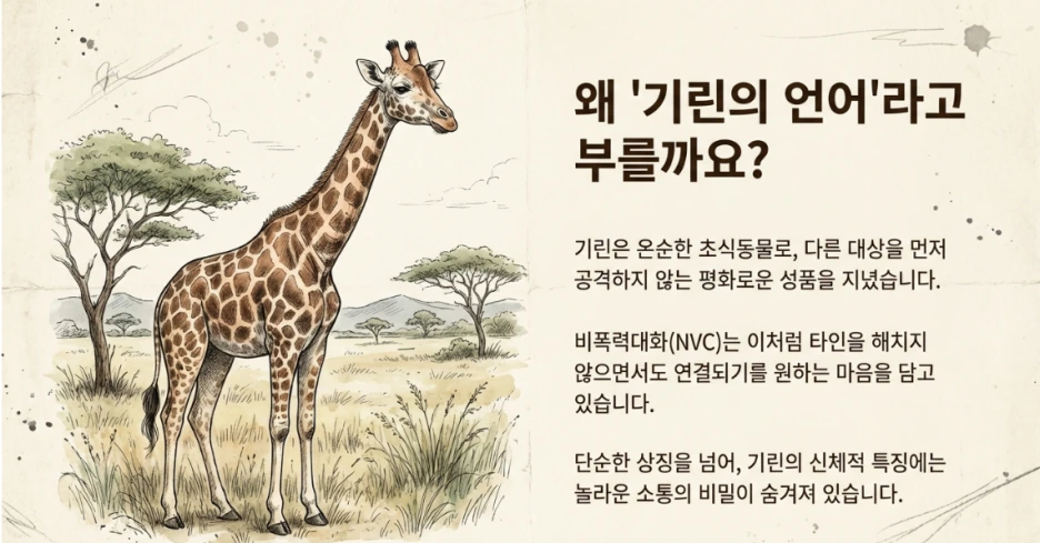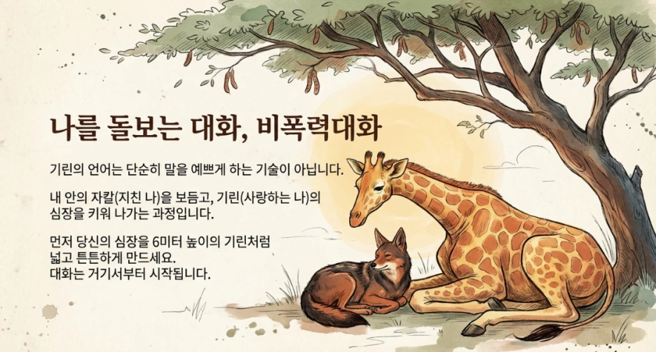 비폭력 대화는 그 '침'을 만드는 연습입니다. 상처받은 순간에도 나와 상대를 따뜻하게 대할 수 있는 힘. 그것이 바로 우리가 배워야 할 기린의 언어입니다.