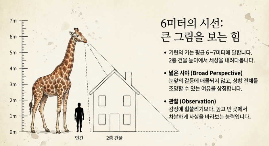 그리고 속으로 말해봅니다. '내일은 조금 더 기린의 마음으로 너를 볼게.' 그것으로 충분합니다.