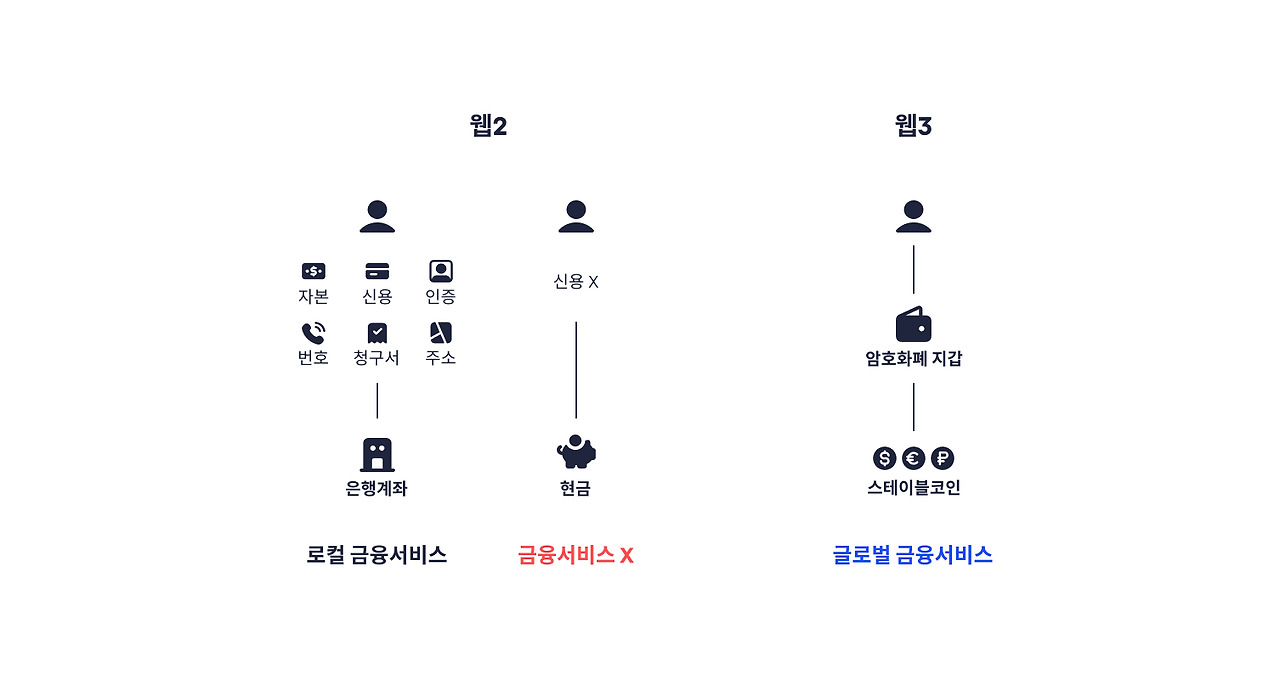 전 세계 인터넷 사용자가 약 50억 명 정도이고 이 중에서 17억 명은 은행계좌가 없다. 인터넷 인구의 약 1/3이 스마트폰이나 컴퓨터로 인터넷에 접근은 할 수 있지만 금융활동을 하지 못한다. 17억 명은 자본과 신용 없이도 핸드폰 버튼 몇 번을 누르면 암호화폐 지갑을 만들고 스테이블코인을 주고받을 수 있다.