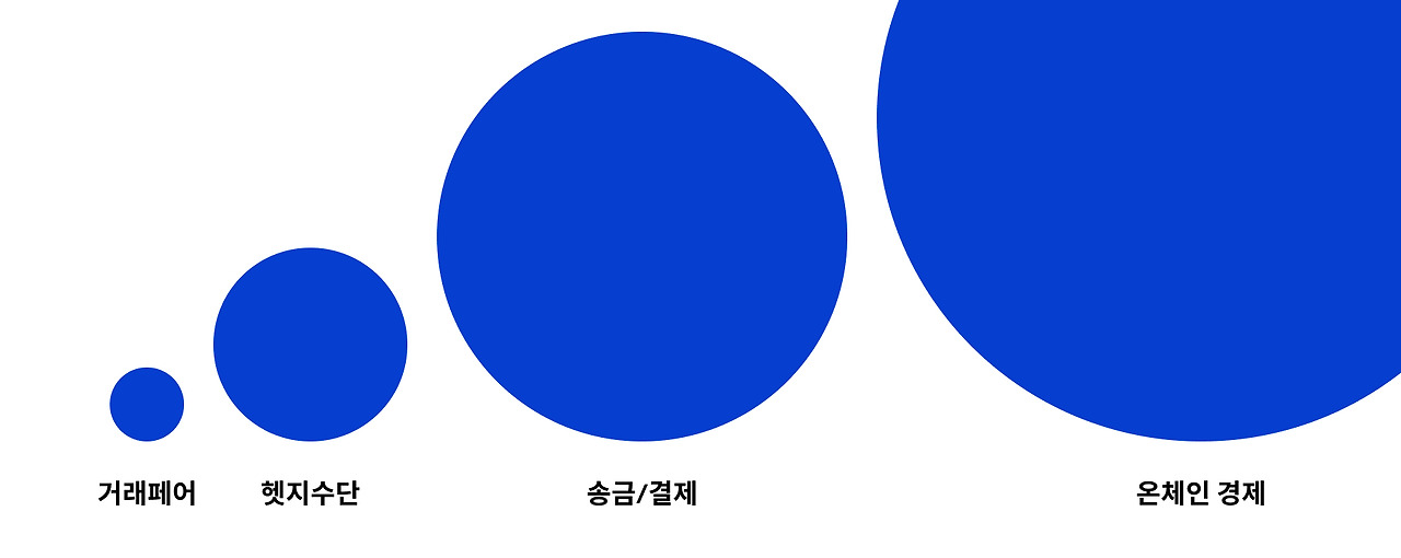 블록체인 산업의 시작인 비트코인의 백서제목은 "개인 간 디지털 현금"이다. 가치의 전송이 근본적인 테마이다 보니 국제송금, 글로벌 소액결제 등 다양한 아이디어와 시도들이 있었지만 대부분 실패했다. 가치변동성 (volatility)이 문제였다. 가격이 매 순간 30%까지 변동하는 암호화폐의 특성상 현실에서 송금과 결제는 작동할 수 없었다.