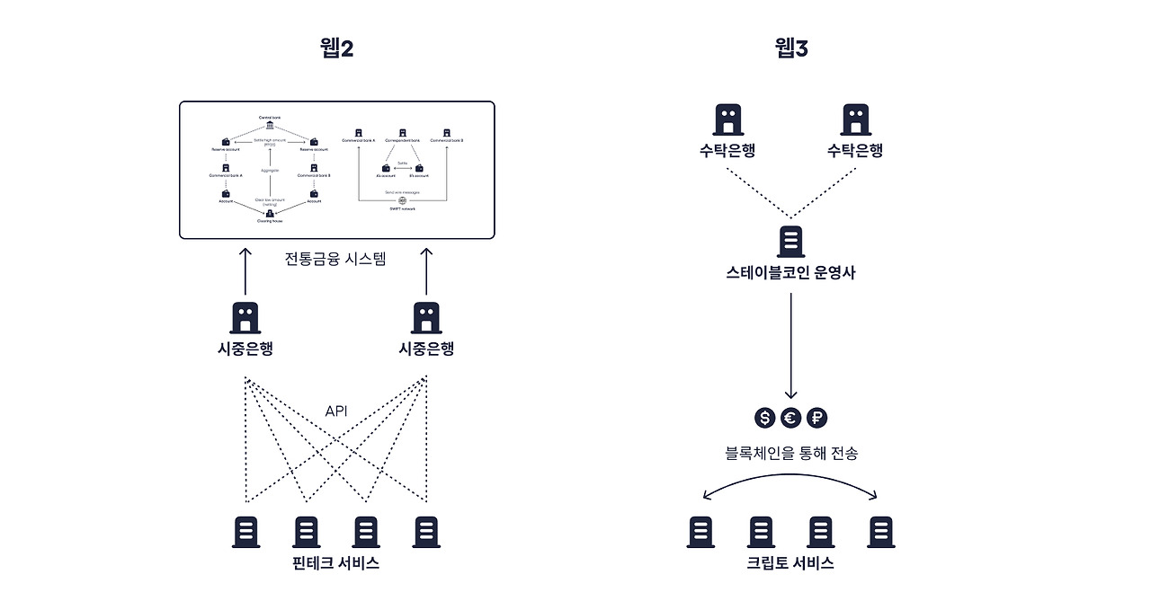 핀테크 기업들은 이러한 기존의 금융시스템을 유지한 채, 은행과 직접 API통신을 하거나 은행망에 연결할 수 있는 오픈뱅킹 인프라를 통해 서비스를 제공한다. 로컬서비스의 경우 별문제는 없지만, 글로벌 수준의 오픈뱅킹 인프라는 존재할 수 없고, 여전히 코레스은행과 스위프트망을 통하기 때문에 비싸고 느리다.