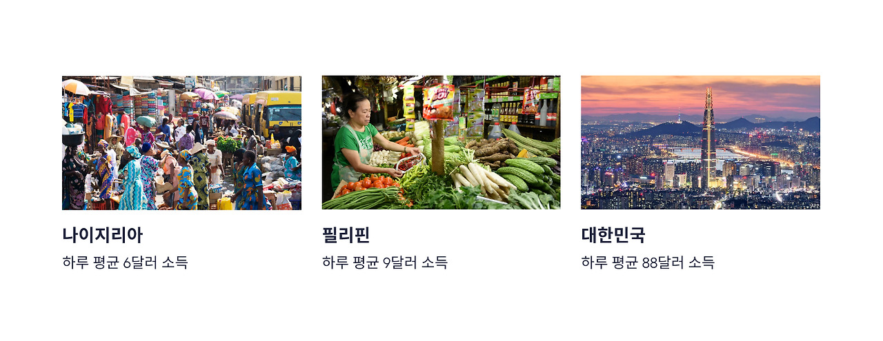 나이지리아는 하루 평균 소득이 6달러다. 필리핀은 9달러, 한국은 약 88달러이다. 개인의 능력이 소득을 결정하는 것이 아니라 내가 사는 국가의 물가와 노동가치가 소득을 결정한다. 우리는 한국기업에서 9시부터 6시까지 일하며 원화를 받고 세금을 내고, 우리나라 물가에 맞는 재화와 서비스를 구매하고 살아간다. 한국에 태어나 살고 있다는 이유만으로 필리핀 국민의 10배 가까운 소득을 받는다.