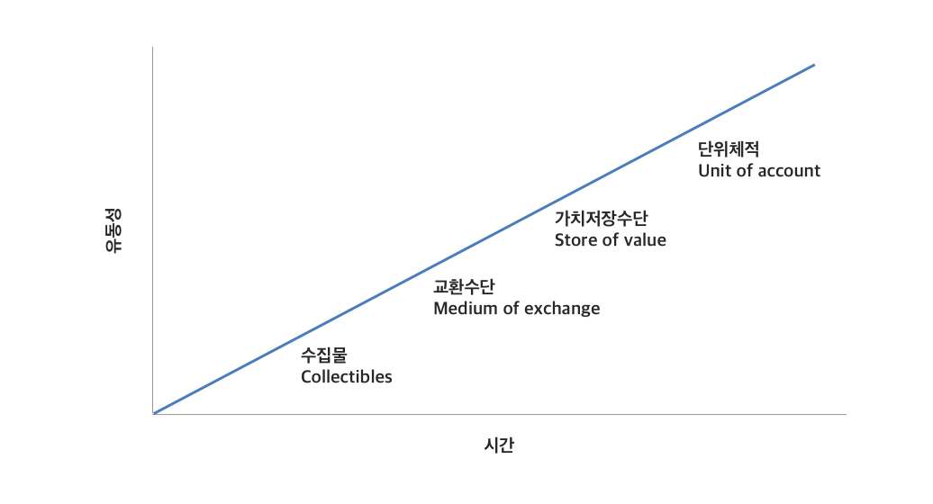실사용 수요에 의해 유동성이 증가하고 가격 변동성이 줄어들면서, 비트코인은 충분히 교환수단 (medium of exchange)과 가치저장 수단 (store of value)의 역할을 할 수 있다. 지금처럼 거래소가 가격 스프레드를 줄여주는 중개를 해줌으로서 교환수단이 되는게 아니고, 통화 발행량에 희소성이 있기 때문에 가치저장 수단이 되는게 아니라, 비트코인 자체가 가진 내재적 가치와 그에 따른 수요 때문에 교환수단과 가치저장 수단이 될 수 있다는 의미이다.