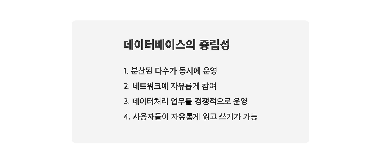 블록체인은 중립 데이터베이스다. 주로 블록체인을 중립성보단 분산성에 더 의미를 두는 경우가 많은데, 분산성에는 그다지 실제적 가치가 없다. 현실에서 분산성은 시스템이나 네트워크의 견고성(robustness)이나 탄력성(resilience)을 기준으로 평가하는데, 아나키즘적 이념이 가득한 블록체인 업계에서 분산성은 곧 탈중앙화, 검열저항성으로 받아드려지기 때문에 이념적 가치만 존재한다. 또한 기업들이 블록체인을 적용한답시고 프라이빗 형태로 서버를 나누는 건 그저 비효율적인 분산 시스템을 구축한 거나 다름없다. 블록체인은 중립적일 때 그 가치가 빛난다.