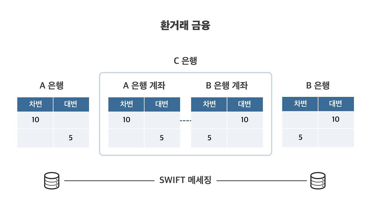 송금을 할 때 신한은행은 도이치은행으로 돈을 직접 보내지 않는다. 신한은행은 SWIFT를 통해 도이치은행에게 얼마의 돈을 보낸다는 메시지를 전달하고, 신한은행과 도이치은행이 각각 고객으로 있는 미국의 시티은행이 이 두 거래은행의 계좌에서 이체 (환거래 금융)한다. 즉 시티은행이 신한과 도이치의 장부를 들고 있을 뿐, 삼식부기라고는 볼 수 없다.