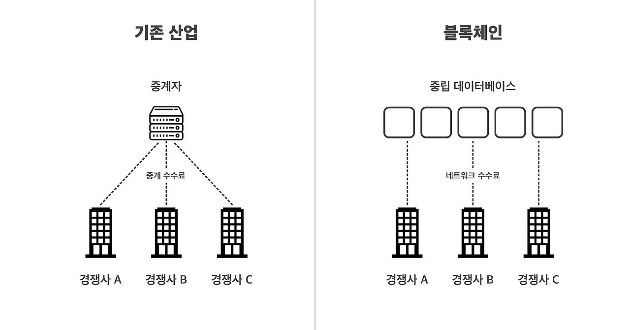 반면에 중립 DB는 권한/관리자가 없는 클라우드 형태의 데이터베이스로서, 어느 누구나(=채굴자) 자본과 기술력이 있다면 데이터베이스로서의 역할을 할 수 있다. 이렇게 모인 DB들은 서로 연결되어 네트워크를 구성하고, 경쟁적으로 데이터를 받아 입력하고, 합의를 통해 데이터의 이중기록을 방지한다.